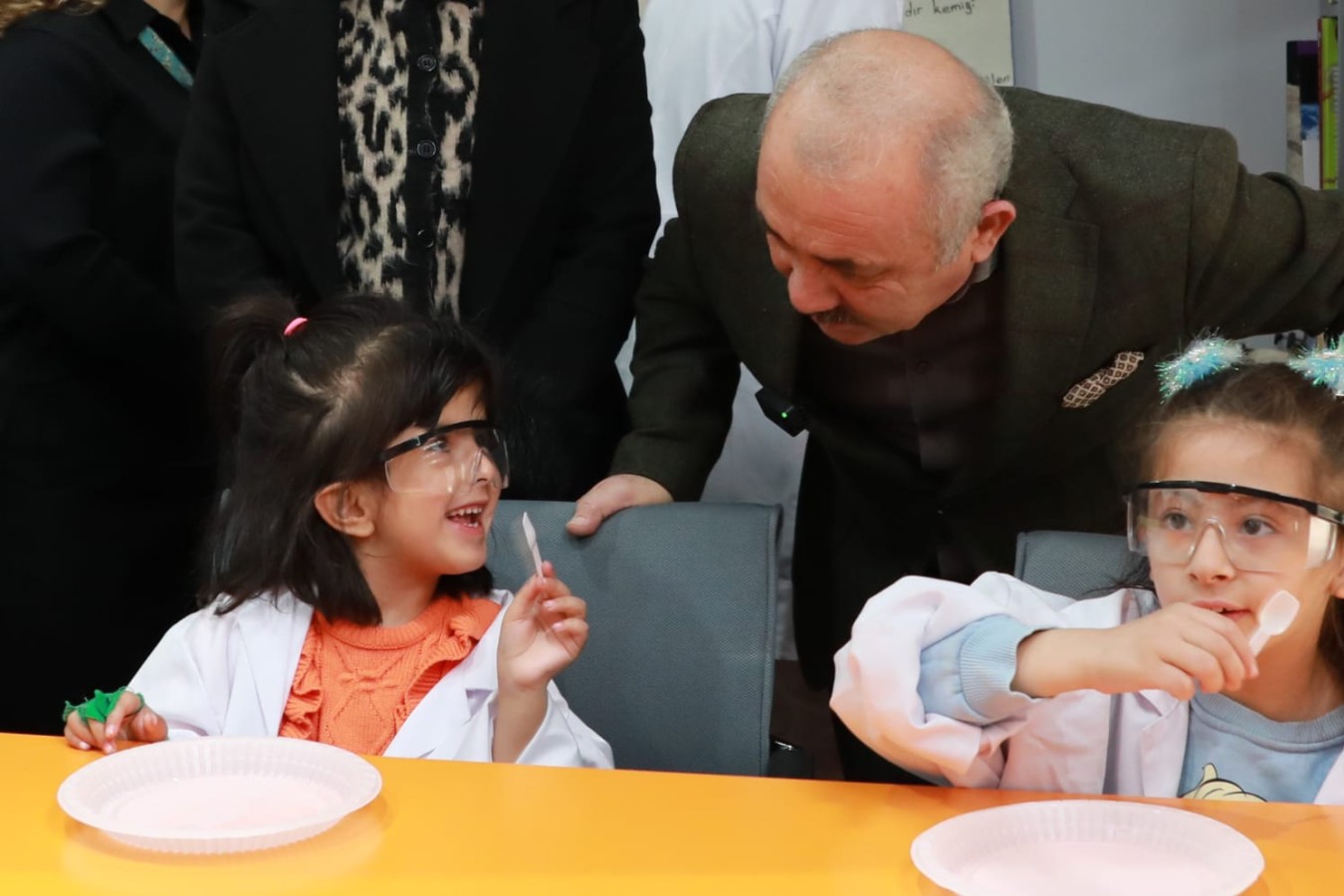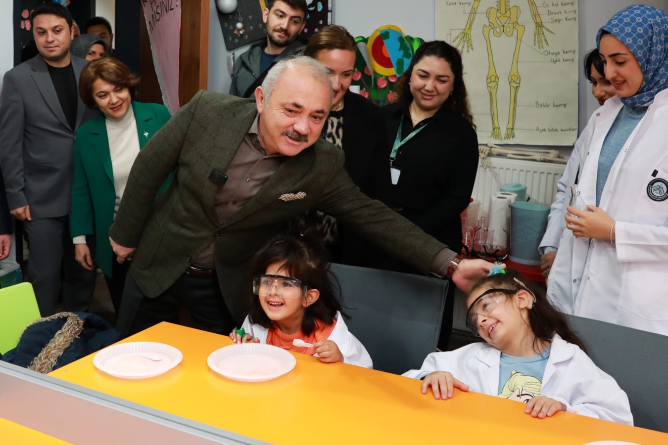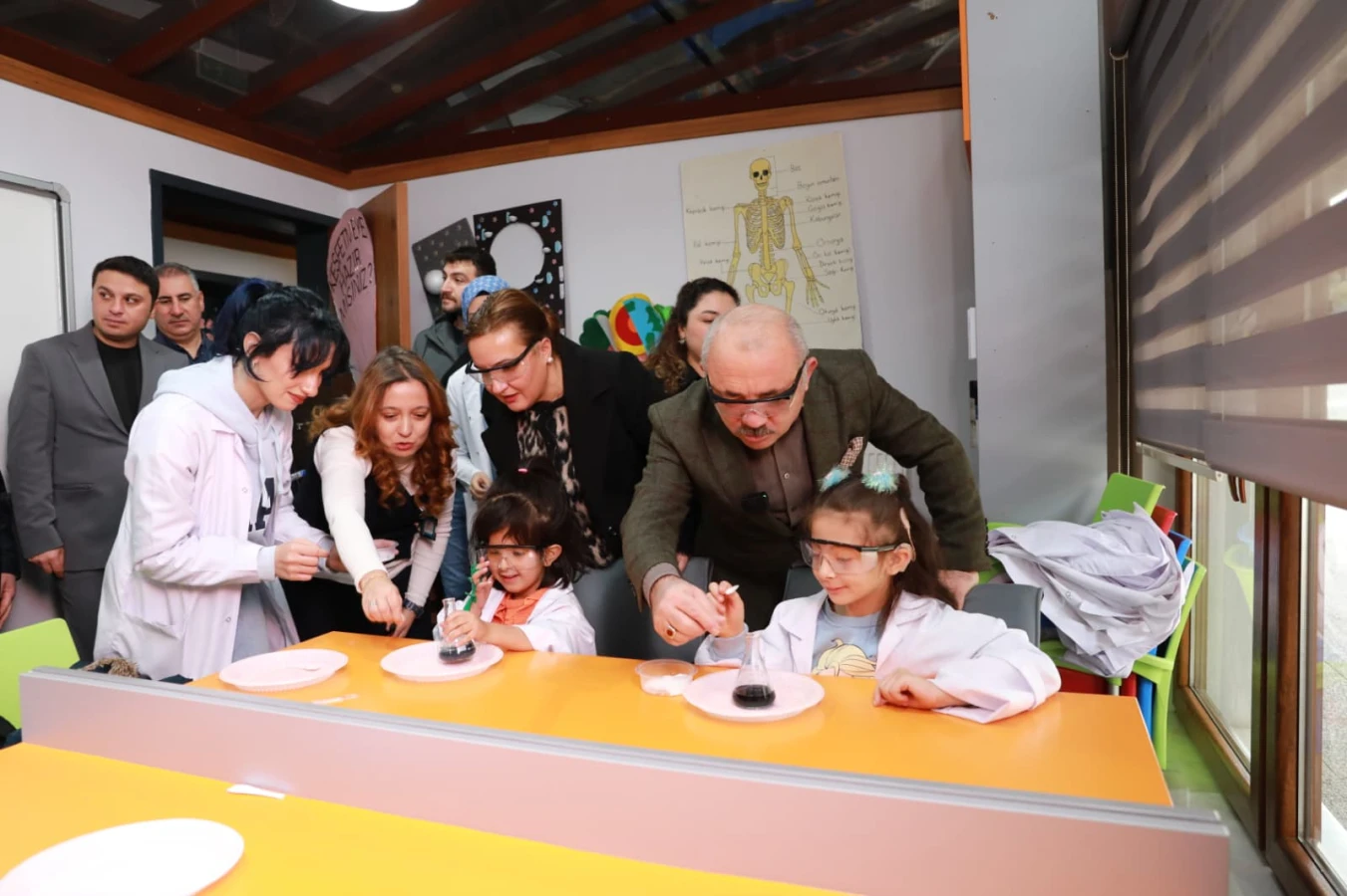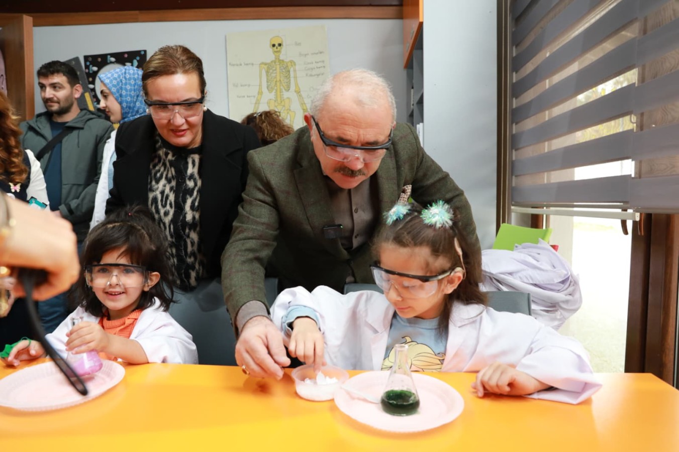 Fatih Sultan Mehmet Çocuk Akademisini gezen çocuklar, uygulamalı bilim çalışmalarına da katıldı. Renkli sıvılar ve roket deneyini titizlikle gerçekleştiren çocuklar, deneyin tüm aşamalarını Başkan Esen’e anlattı.
