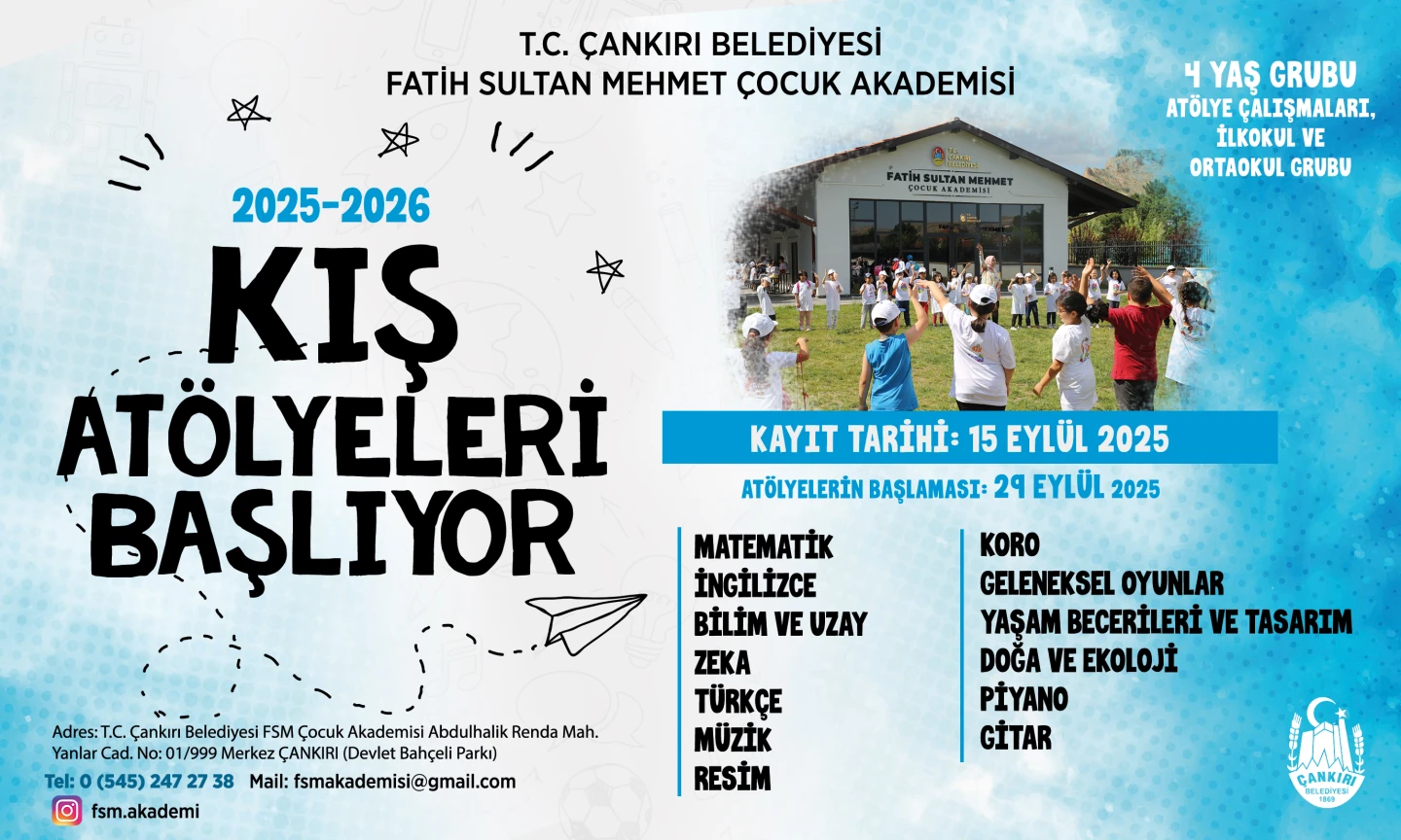 Uygulamalı yaz atölyelerini tamamlayan Çankırı Belediyesi Fatih Sultan Mehmet Çocuk Akademisi, kış atölyeleri için kayıt almaya hazırlanıyor. 2025-26 eğitim öğretim dönemi kış atölyelerinin kesin kayıt tarihi 15 Eylül Pazartesi günü olarak belirlendi. Başvuru sırasına göre alınacak kayıtlar, kontenjan ile sınırlı olacak.