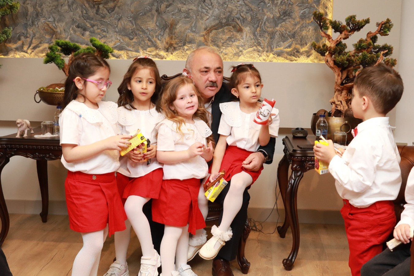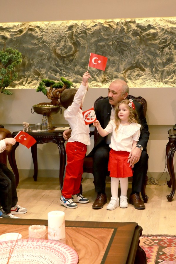 Renkli görüntülere sahne olan ziyarette çocuklar, ellerinde Türk bayrakları ile makam odasını adeta bayram yerine çevirdi. Başkan Esen’in boynuna sevgi ile sarılan minikler, sırayla makam koltuğuna oturarak hayallerini dile getirdi.