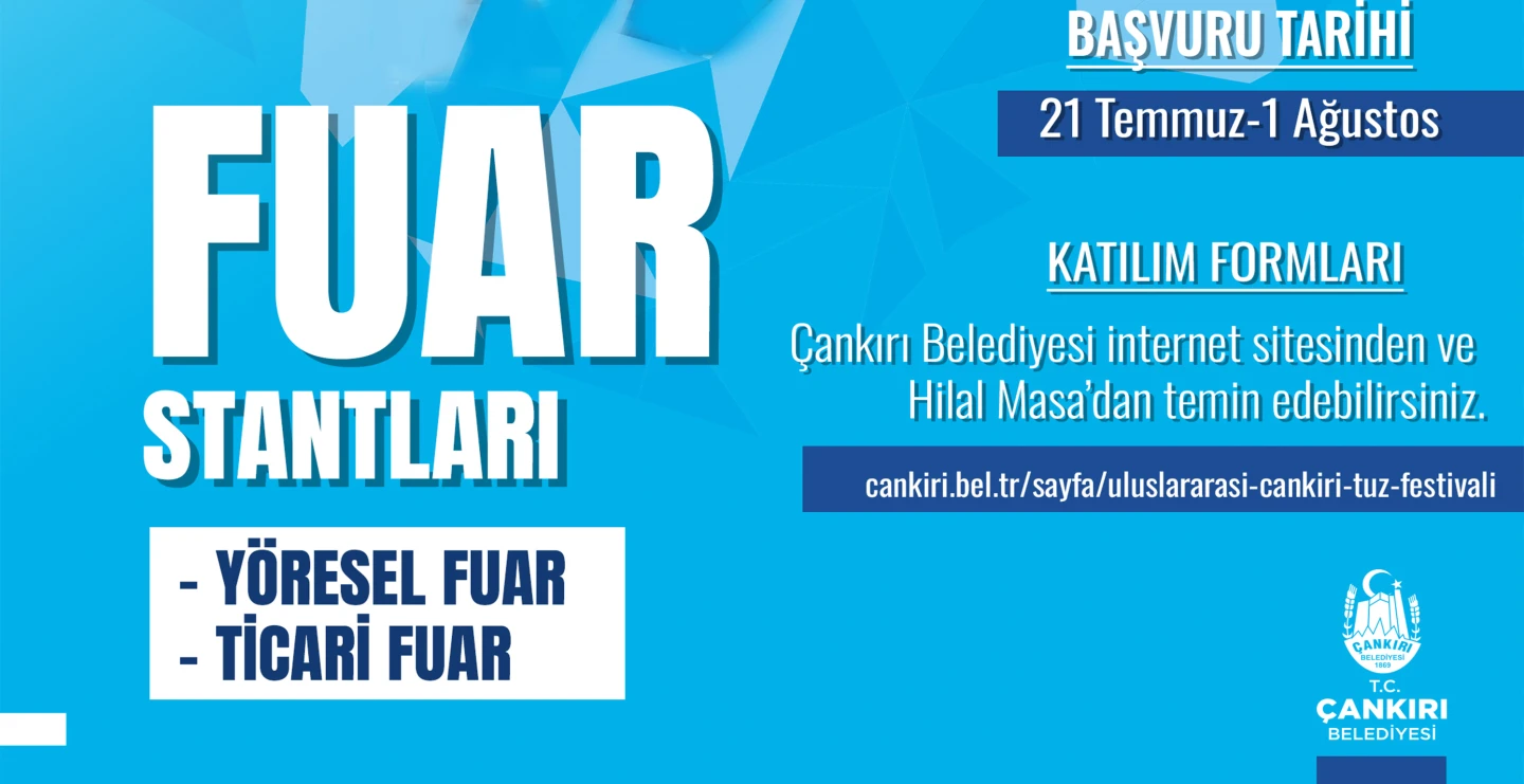 Çankırı Belediyesi, 15-16-17 Ağustos’ta düzenlenecek 4. Uluslararası Çankırı Tuz Festivali’nde açılacak fuarlar için başvuruları 21 Temmuz’dan itibaren almaya başlayacak. Yöresel ve Ticari olmak üzere iki ayrı fuarda stant kiralamak isteyen vatandaşlar, başvuru formlarına Belediyenin resmi internet sitesinden ve Hilal Masa’dan ulaşabilecek. Doldurulan formlar, 1 Ağustos Cuma günü mesai bitimine kadar Belediye Hilal Masa’ya teslim edilecek.