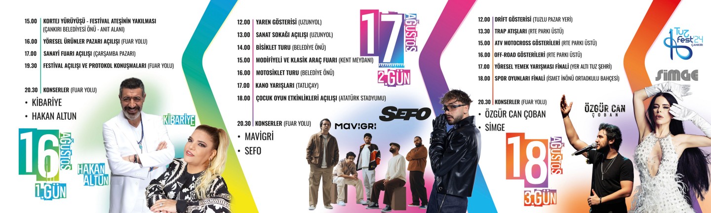 Gündüz ve akşam etkinlikleri ile üç gün boyunca sürecek festival, Fuar Yolu’nda düzenlenecek konserler ile eğlencenin dozunu daha da arttıracak. TUZFEST; 16 Ağustos akşamı ünlü sanatçılar Kibariye ve Hakan Altun, 17 Ağustos akşamı Mavigri ve Sefo, 18 Ağustos akşamı ise Özgür Can Çoban ve Simge konserlerine ev sahipliği yapacak.