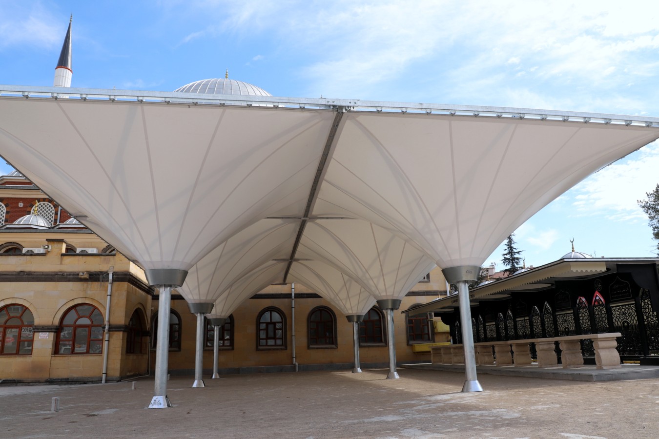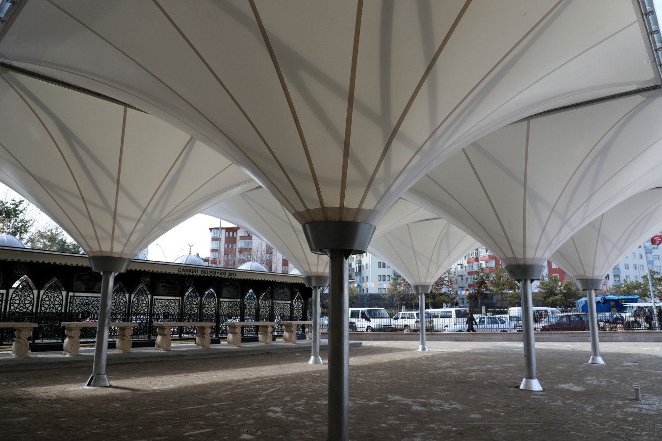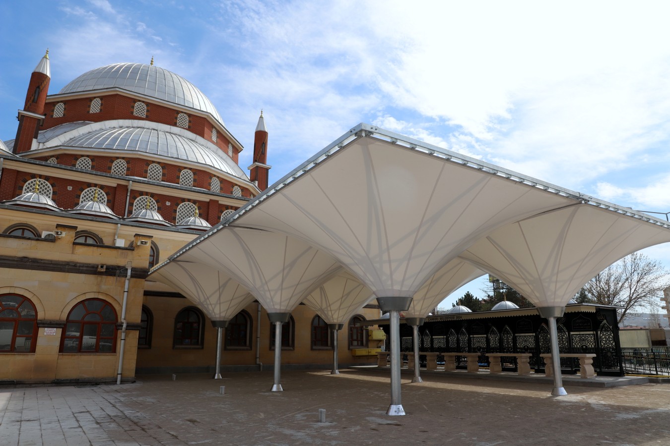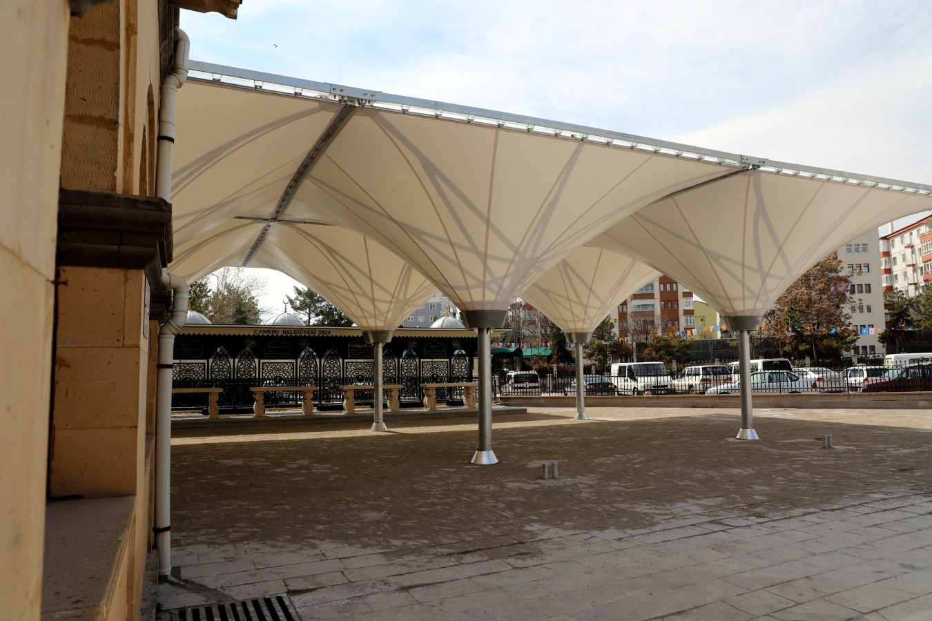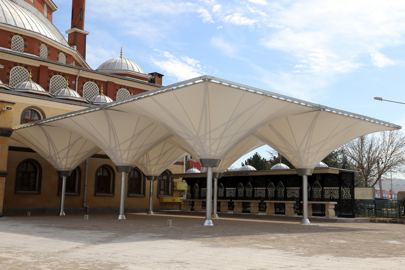 Her biri 6x6 ebatlarında 36 metrekare alanı kapatan şemsiyeler, toplam 216 metrekarelik alana konfor sağlayacak. Çelik konstrüksiyon üzerine asma germe sistemi ile monte edilen şemsiyeler, özellikle cenaze namazı sırasında namaz kılan cemaate son görev esnasında olumsuz hava şartlarından koruyacak.