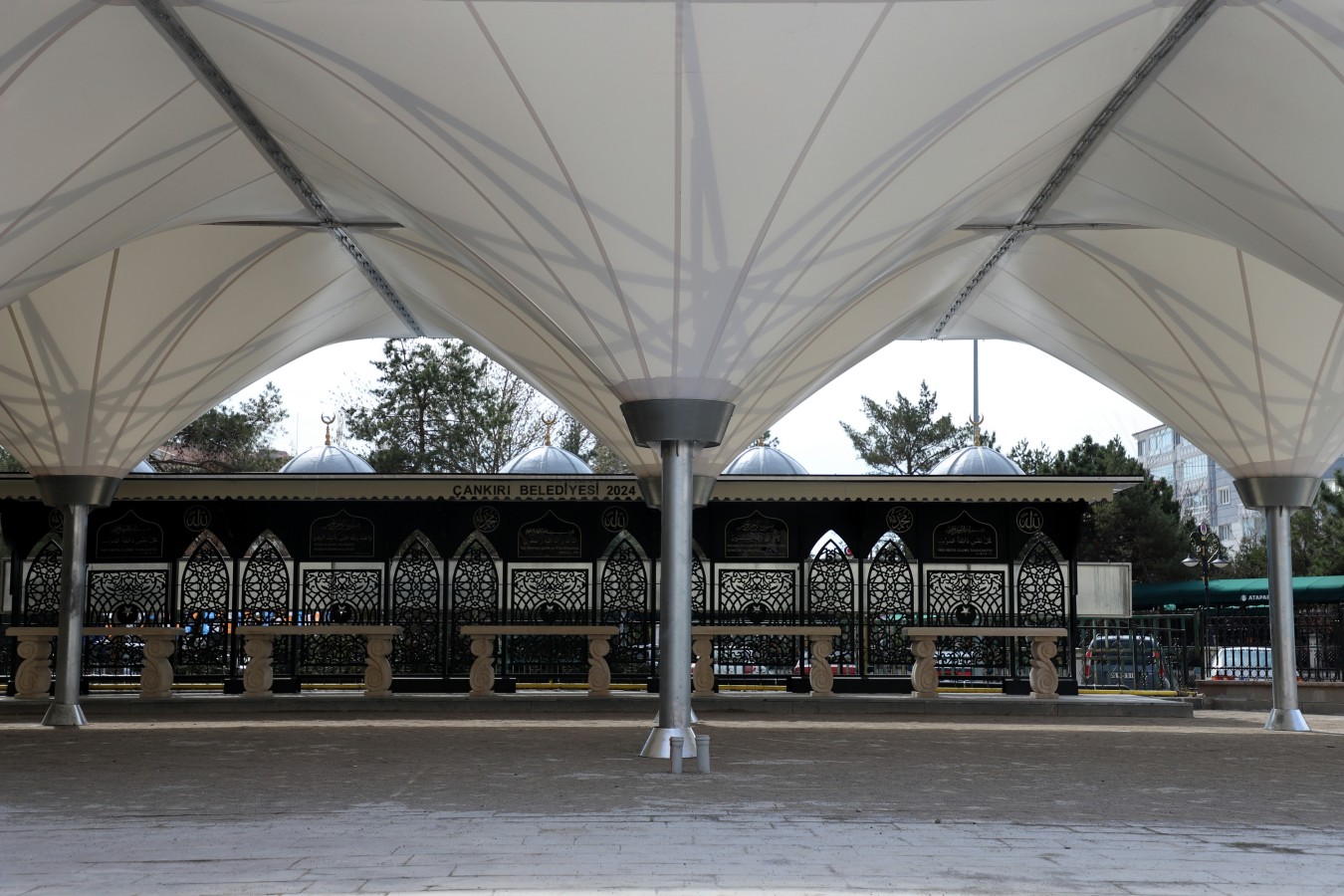 Hoca Ahmet Yesevi Cami önündeki musalla taşlarını yenileyen Çankırı Belediyesi, alana ibadethaneye uygun ters şemsiye monte etti. Altı adet şemsiyeden oluşan tasarım, alana estetik bir görünüm kazandırırken cenaze namazı kılan vatandaşları yağmurdan ve güneşten koruyacak.