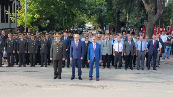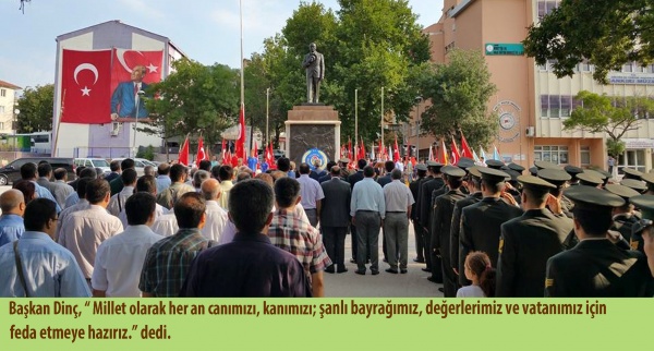 Konuşmasında ülke genelinde kaosa sebep olmak isteyen teröre ve onların hain girişimlerine karşı verilen mücadeleye dikkat çeken Başkan Dinç, Türkiye Cumhuriyeti Devleti’ni bölmek, parçalamak, milli birlik ve bütünlüğümüzü ortadan kaldırmak için küresel güçler ve onların yerli işbirlikçilerinin iyice azgınlaştığını ifade ederek, “Millet olarak; biz de her an canımızı, kanımızı şanlı bayrağımız, değerlerimiz ve vatanımız için feda etmeye hazırız” dedi. Başta Türk Silahlı Kuvvetler devletin tüm savunma güçleri ile küresel güçlere ve onların yerli işbirlikçilerine, piyonlarına karşı kahramanca mücadele veriliğini belirten Dinç, “Biz yedi düveli dize getirmiş bir milletiz. Yedi düvel geçmişteki iştahını kabartmış bir şekilde tekrar saldırıyor. Ne olursa olsun, biz biliyoruz ki, Yüce Allah bizimle beraberdir. Biz yeter ki milli birlik ve bütünlüğümüzü sekteye uğratmayalım. Bu milli birlik ve beraberlik ruhunu aynı heyecanla bugün de taşıyoruz, Allah’ın izni ile yarın da taşıyacağız. Bu aziz millete, bu şanlı bayrağa ve değerlerimize hiç kimsenin kastetmesi, onu dize getirmesi mümkün değil. Geçmişte olduğu gibi; Şerife Bacıların, Yanığın Eminelerin, Seyid Ali Çavuşların fedakârlığı halen gündemdedir. Bu olduğu müddetçe, bizim sırtımızı hiçbir gücün, hiçbir kuvvetin, hiçbir kudretin yere getirmesi imkân dâhilinde değildir.” ifadelerine yer verdi.