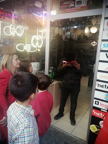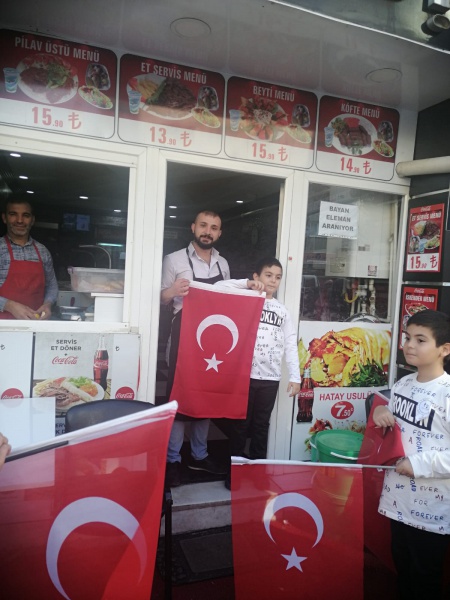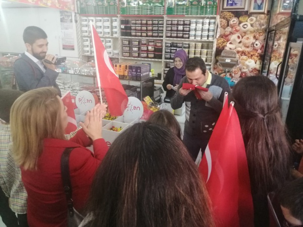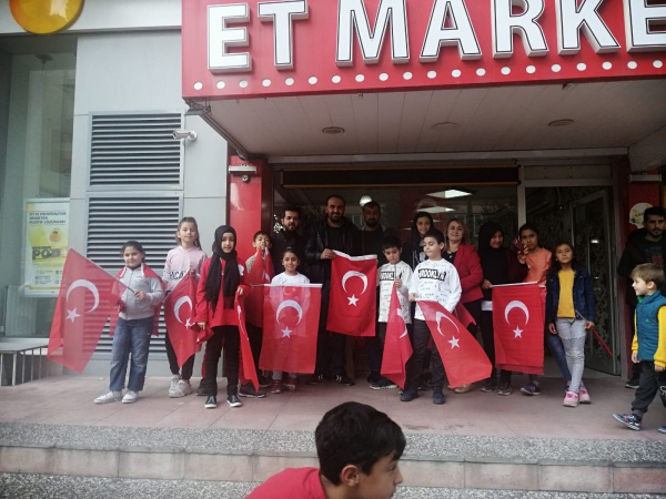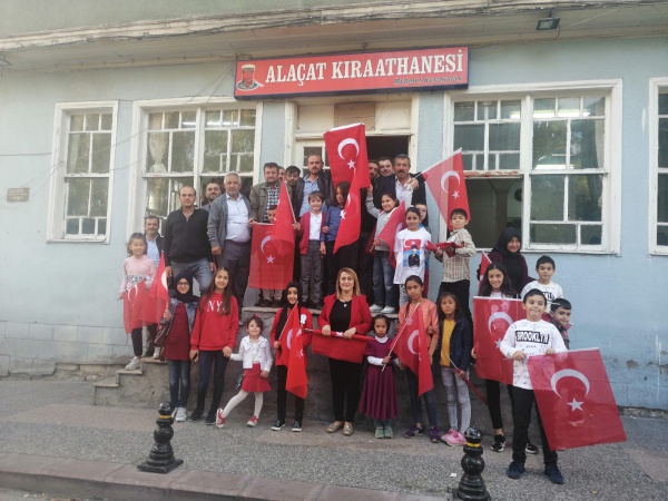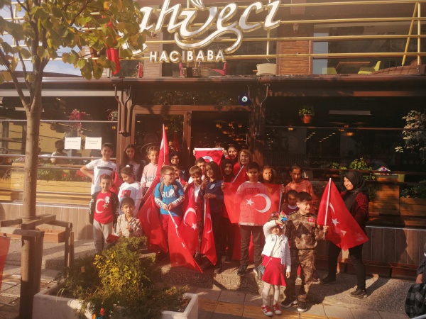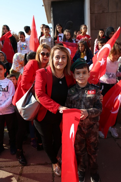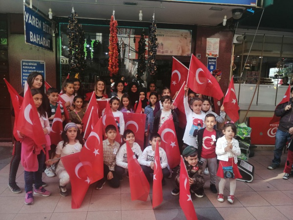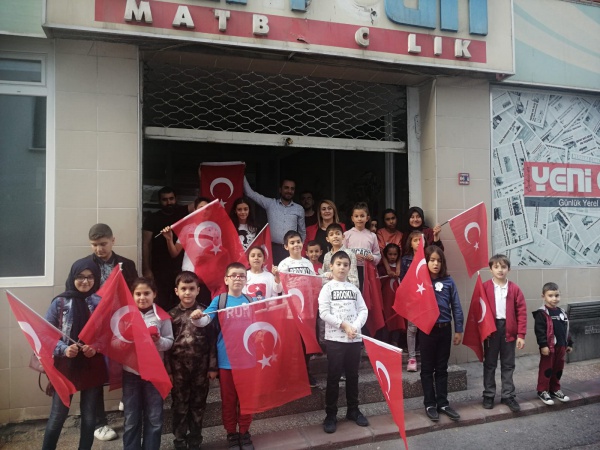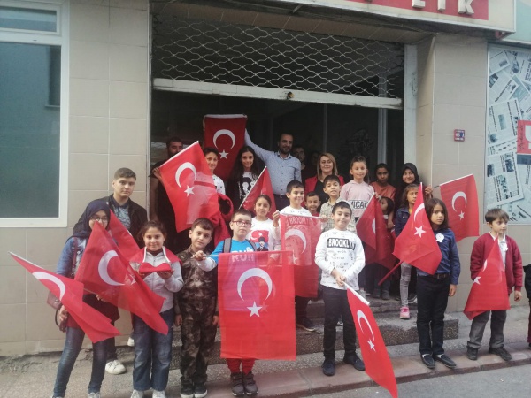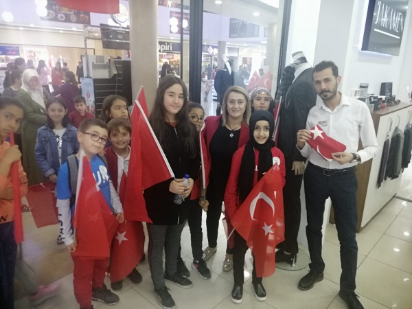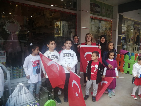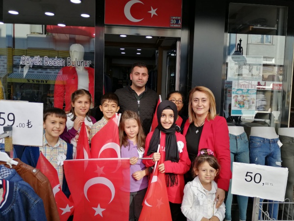 Çankırı merkezdeki iş yerleri, Belediye Çocuk Meclisi üyelerinin dağıttığı ay yıldızlı bayraklar ile süslendi. Çocuklar, ailelerinin de katıldığı etkinlikte, Cumhuriyet’in kuruluşunun 96. yıl dönümü için 170 adet bayrak dağıttı. Yunus AVM girişinde bir araya gelen çocuklar, İstiklal Marşı okuduktan sonra 10. Yıl Marşı eşliğinde esnafları dolaştı. Çocukları iş yerlerinde karşılayan esnaflar, bayrakları öperek teslim aldı ve büyük bir gururla iş yerlerine astı. Çocuk Meclisi üyelerinden Emirhan Cengiz, “ Kanla kazanılmış toprakların çocukları olarak, bağımsızlığın ne demek olduğunu çok iyi biliyoruz. Atamızın mirası Cumhuriyet’i, onun hür çocukları olarak ilim, irfan, bilim ve ahlak ile korumaya devam edeceğiz. Cumhuriyetimizin kuruluşunun 96. yılında dağıttığımız ay yıldızlı bayrak, bizim onurlu geçmişimiz, destansı tarihimiz ve aydınlık geleceğimizdir. Bayrağımızı, atalarımızdan yadigâr azim ve kararlılıkla dalgalandırmaya devam edeceğiz. Cumhuriyet Bayramımız kutlu olsun.” dedi.