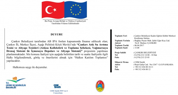 Çankırı Belediyesi tarafından AB IPA fonları kapsamında finanse edilecek olan Çankırı ili, Merkez ilçesi, Aşağı Pelitözü köyü mevkiinde “Çankırı Atık Su Arıtma Tesisi ve Altyapı Tesisleri (Atıksu Kollektörü ve Toplama Şebekesi, Yağmursuyu Drenaj Sistemi ile İçme Suyu Depoları ve Altyapı Sistemi)” projesi için halkı bilgilendirme toplantısı yapılacak.