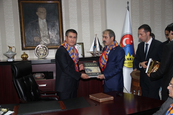 Başkan Dinç, görüşme sonrasında Bakan Canikli’ye belediye yayınları arasında yer alan, Çankırı kültürünü ve tarihini anlatan kitaplar ve Saray sehpası hediye etti.