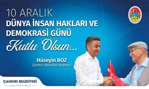 Çankırı Belediye Başkanı Hüseyin Boz, 10 Aralık İnsan Hakları Günü dolayısı ile bir mesaj yayınladı. Başkan Hüseyin Boz, Birleşmiş Milletler İnsan Hakları Evrensel Beyannamesi'nin kabul edilişinin 70. yıl dönümü dolayısı ile tüm dünya insanlığının İnsan Hakları Günü’nü ve Demokrasi Haftası’nı kutladı. Boz, mesajında şu ifadelere yer verdi: