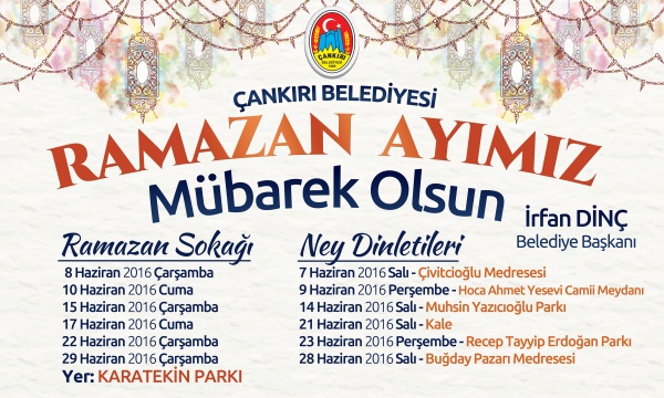 Kültürel değerlerimizi ve geleneklerimizi yaşatmak adına, her yıl olduğu gibi bu Razamazan'da da iftar sofralarında bir olacağız. Çarşamba ve Cuma akşamları Karatekin Parkı'nda geleneksel Ramazan Sokağımızı kuracağız. Salı ve Perşembe akşamları da ney dinletilerimiz ile vatandaşlarımıza manevi bir atmosfer oluşturacağız.