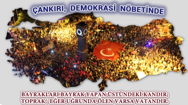 Hanımefendisi, beyefendisi, gençleriyle, sevgili yavrularımızla Çankırı’da yürekleri mehter davulu gibi gümbürdeyerek Belediye Meydanından “Biz buradayız, biriz, birliğiz, bu vatanı böldürtmeyeceğiz.” sesleri yükseliyor her ilimizde olduğu gibi. Türkiye, en büyük sınavını birlik ve beraberlik içerisinde dini, dili, ırkı, siyasi görüşü ne olursa olsun içimizdeki ve dışımızdaki hainlere en büyük cevabı tek yürek, tek yumruk, tek bayrak, tek millet olarak verdi. Ülkesine ve geleceğine sahip çıkan tüm vatandaşlarımıza canı gönülden teşekkür ediyor ve Allah razı olsun diyorum. Birlik ve beraberliğimiz daim olsun.