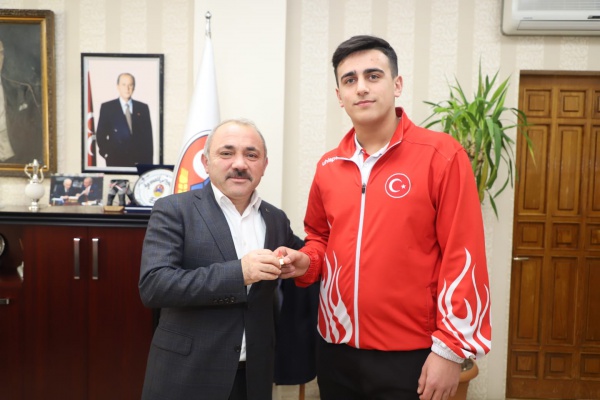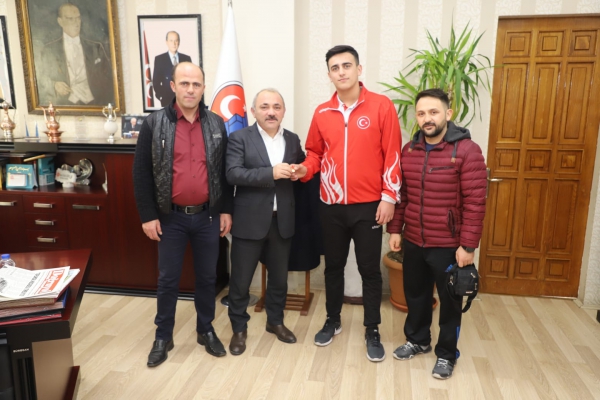 İsrail’in Eilat kentinde 07-14 Aralık 2019 tarihleri arasında düzenlenen Avrupa Halter Şampiyonası’nda; 102 kilo sikletinde U15 ve Yıldızlar kategorisinde yarışan sporcumuz Taner Çağlar,  koparmada ve silkmede toplamda 264 kilo kaldırarak Avrupa 3.sü olmuştu. Belediye Başkanı İsmail Hakkı Esen, 2019 yılını başarı ile kapatan sporcuyu makamında ağırladı. Genç halterciyi tebrik eden Esen, “Halterde Naim Süleymanoğlu’nun izinde giden bir gençlik yetişiyor. Ülkemizi uluslararası arenada en iyi şekilde temsil ederek Türk halterine ismini yazdıran Çankırılı gençlerimiz ile gurur duyuyoruz. Antrenörümüzü ve sporcumuzu tebrik ediyor, bu alanda ilerlemek isteyen gençlerimize de örnek olmalarını diliyorum.” dedi.  Çağlar ise madalya sevinçlerini Başkan Esen ile paylaşmaktan mutluluk duyduklarını belirterek destek veren herkese teşekkür etti.