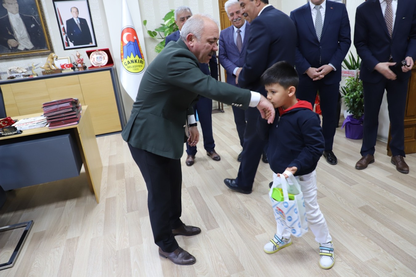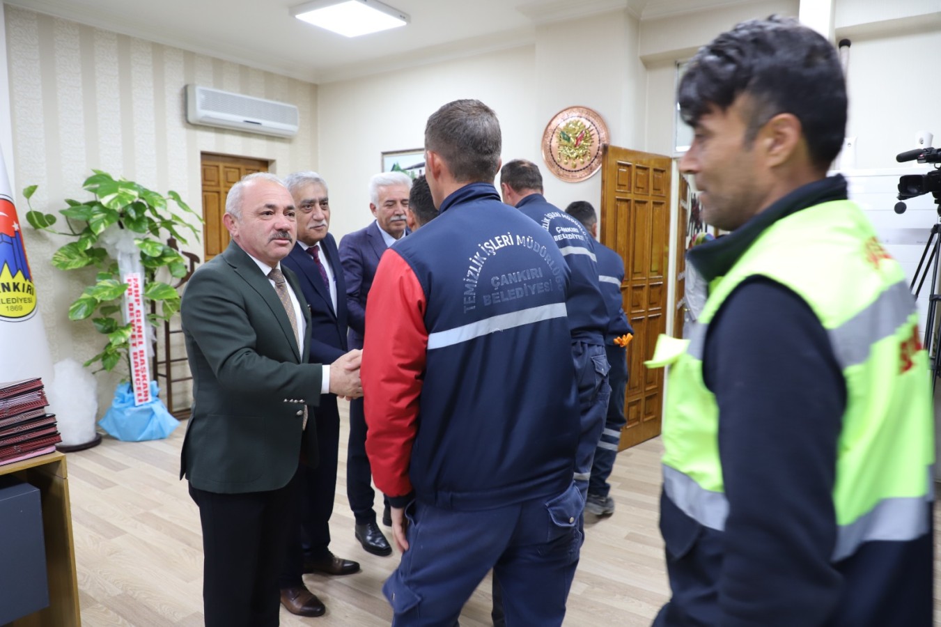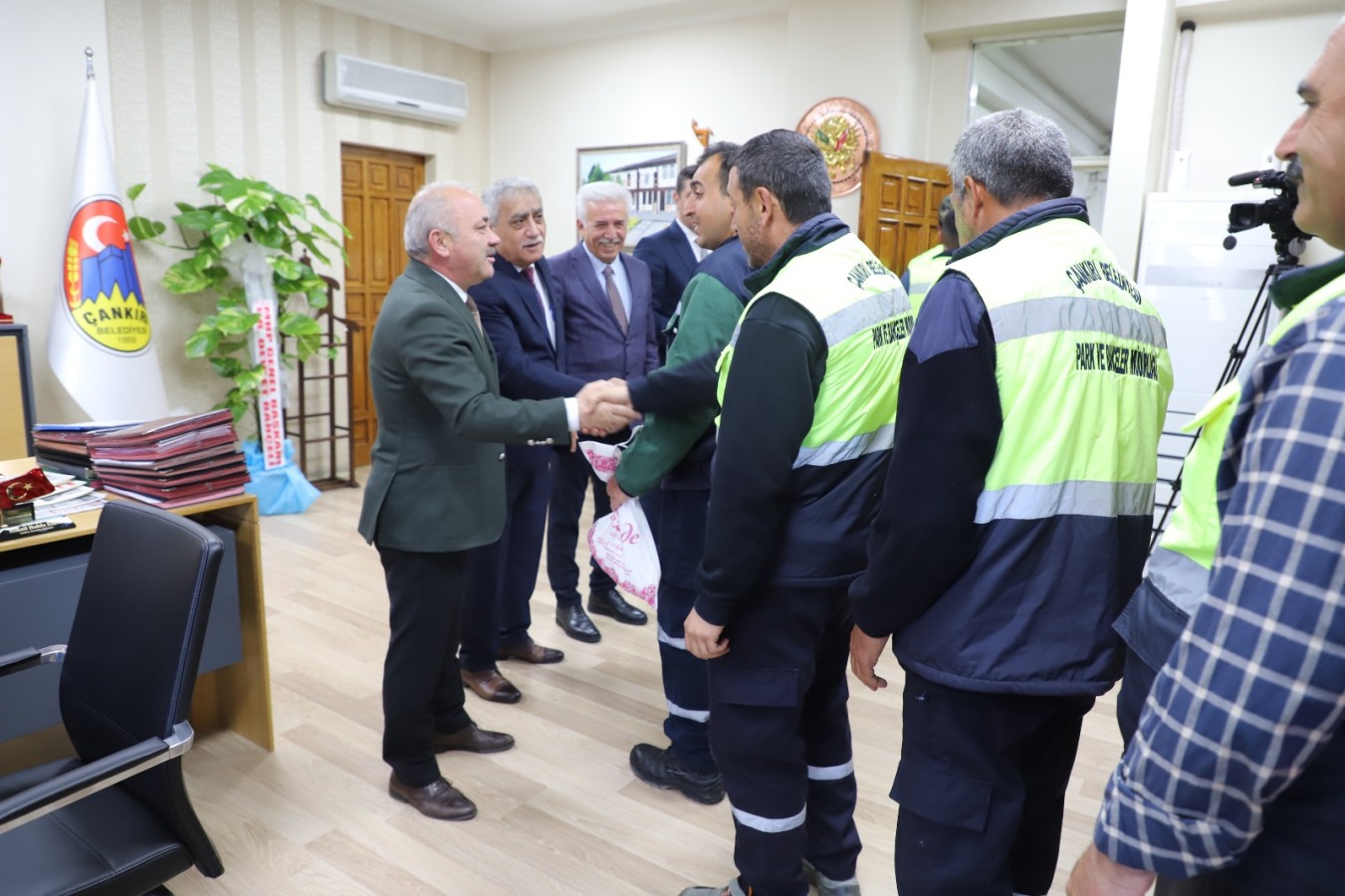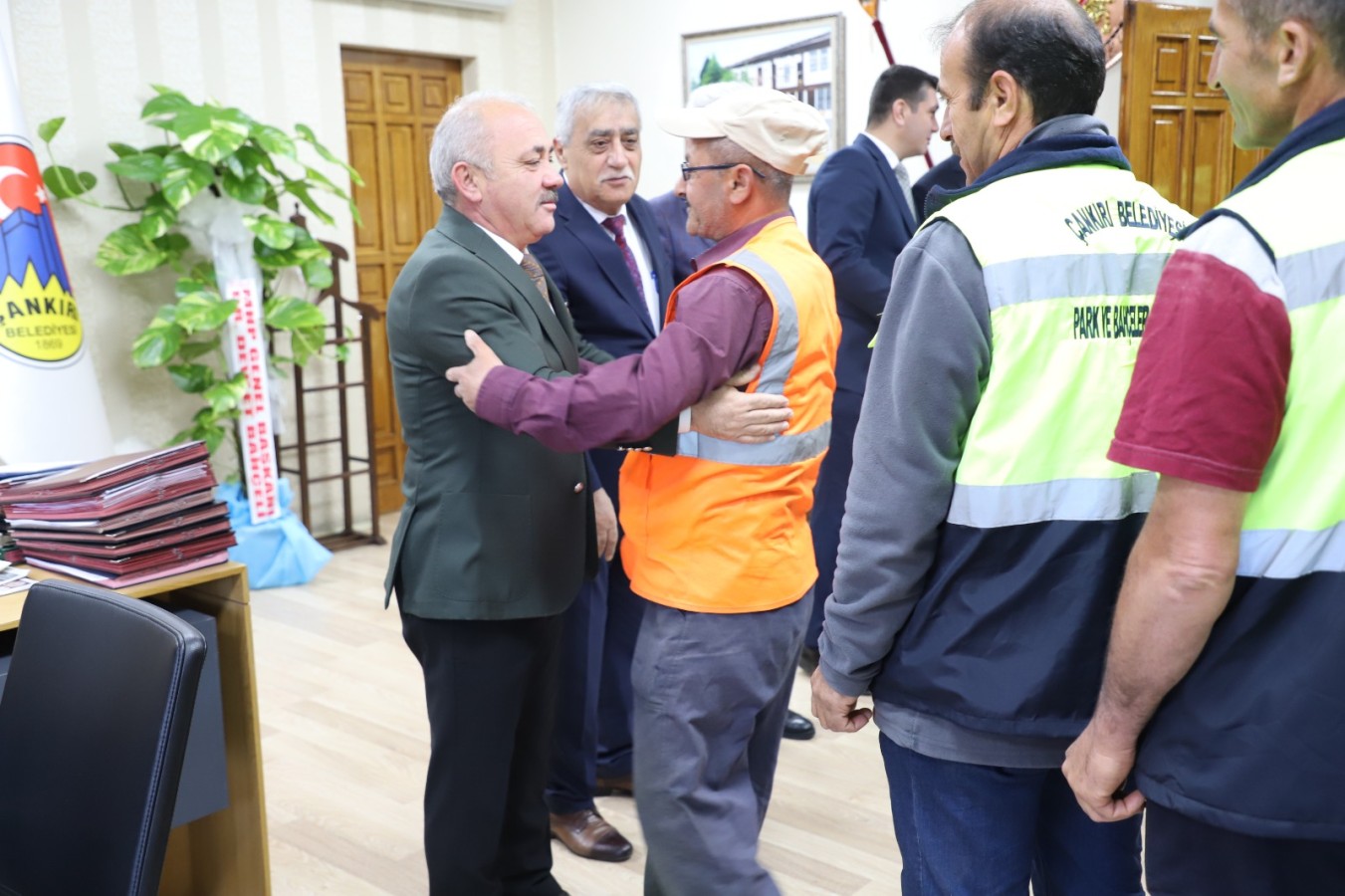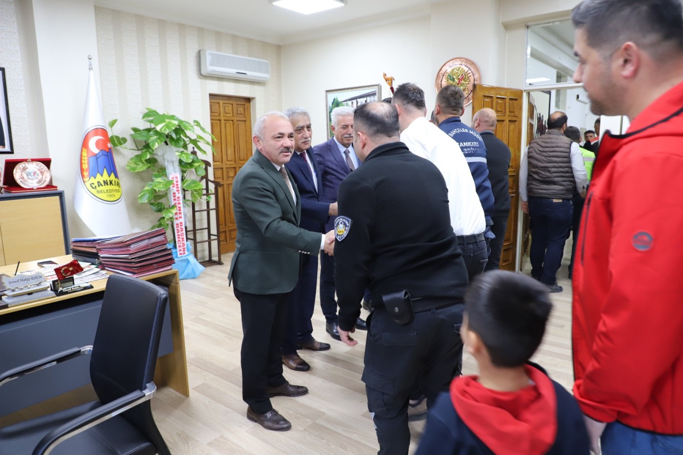 Çankırı Belediyesi çalışanları bayramlaşma geleneği için bir araya toplandı. Belediye birimlerinde çalışan personel ile tek tek bayramlaşan Başkan Esen, personellerinin hatırlarını da sordu. Kolonya ile çikolatanın ikram edildiği bayramlaşma geleneği, personel arasında da devam etti.