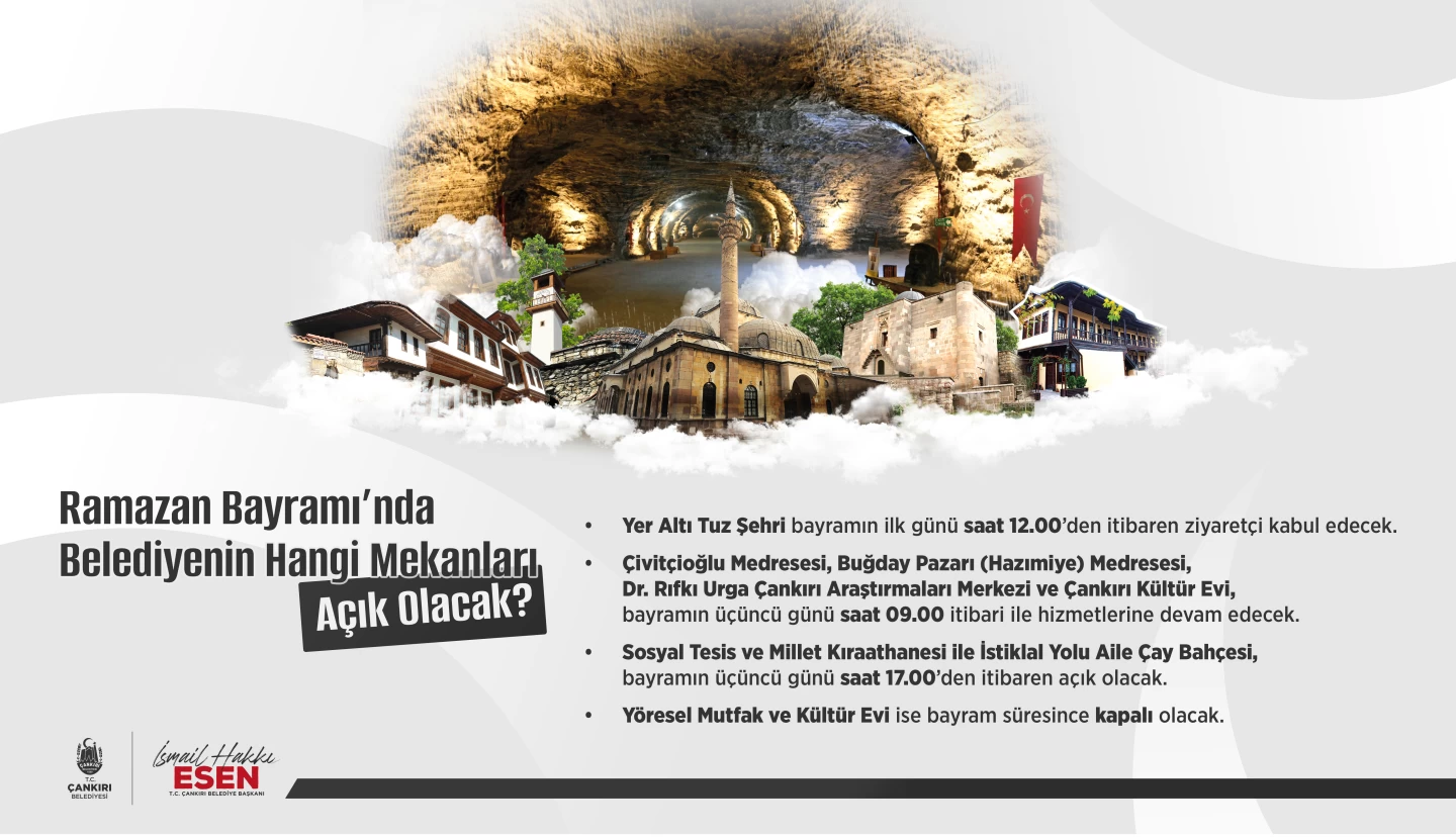 Ramazan Bayramı süresince yerli ve yabancı ziyaretçilerin herhangi bir mağduriyet yaşamasını önlemek amacı ile Çankırı Belediyesi, kendi bünyesinde hizmet veren tarihi, kültürel ve turistik alanların hangi günler ziyarete açık olacağını duyurdu.