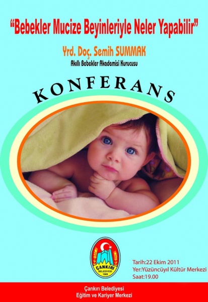 Eğitimin farklı alanlarında çalışmalar yapan Belediyemiz yeni oluşturduğu Eğitim ve Kariyer Merkezi bünyesindeki ilk etkinliğini gerçekleştiriyor. Türkiye’de ilk kez Akıllı Bebek Akademisi’ni oluşturan Yrd. Doç. Dr. Semih Sumak tarafından Çankırılı anne ve babalara 22 Ekim 2011 Cumartesi günü saat 19.00’da “Bebekler Mucize Beyinleri ile Neler Yapabilir” konulu bir konferans verilecek.