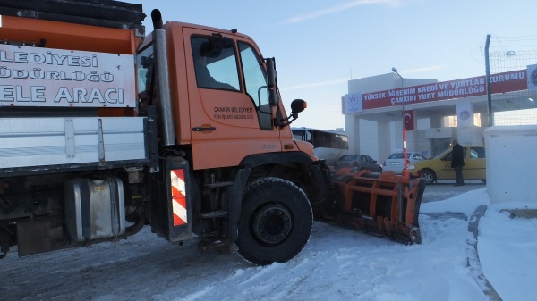 Kar yağışının ardından yolların ulaşıma açık kalması için şehrin genelinde önlemler alan Çankırı Belediyesi, hizmet ve denetimlerini 24 saat boyunca Uluyazı Kampus alanı ve çevresinde de sürdürüyor.