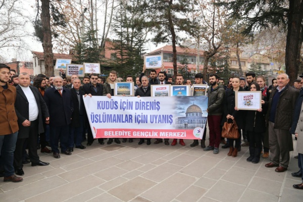 Çankırı’da Kudüs için bu kez gençler seslerini duyurmak için bir araya geldi. Belediye Gençlik Merkezleri adına basın açıklaması yapan Batuhan Dinlemez, “100 yıl önce Balfour deklarasyonu ile Osmanlıdan kopartılan ve sistemli şekilde Filistin’in Yahudileşmesine açılan kapı, bugün üzülerek görmekteyiz ki evvela Filistin’i ardından da Ortadoğu coğrafyasını kan gölüne çevirmiş; huzurun, barışın ve kardeşliğin temeline dinamit koymuştur. 1948 yılında haydutça kurulan İsrail, bugün aynı haydutlukları devam ettirerek Filistin coğrafyasının tamamına hâkim olmuş, Amerika ise bu terörizmi adeta ödüllendirmiştir. Kudüs gibi 3 semavi dinin kutsal saydığı, peygamberlerin doğduğu, yaşadığı ve tebliğ vazifelerini ifa ettikleri bu şehri teröristlerin başkenti olarak tanımış ve Yahudi terörünün inisiyatifine bırakmıştır.” dedi.