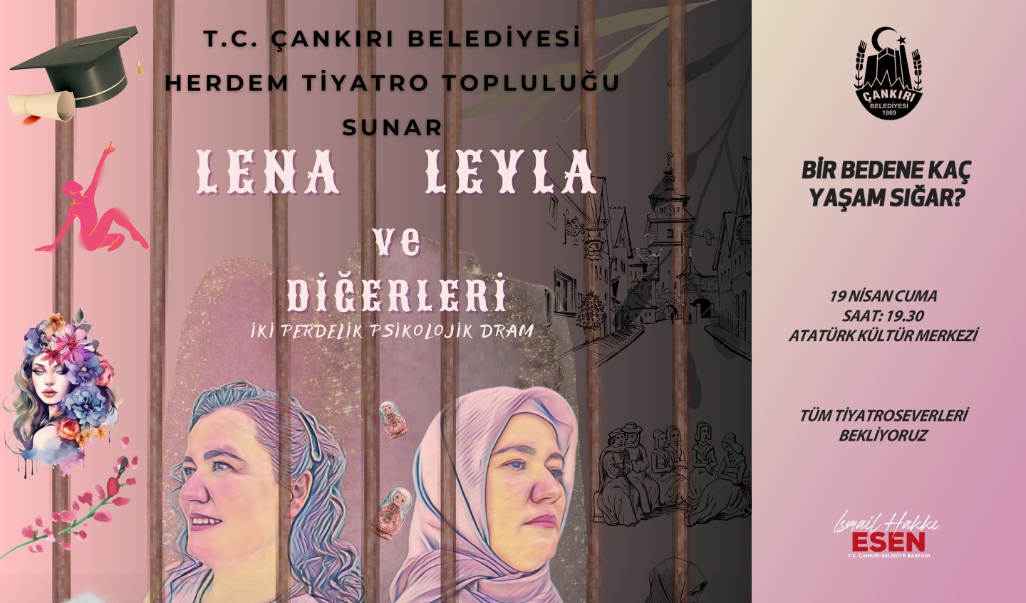 Çankırı Belediyesi Herdem Tiyatro Topluluğu, yeni bir oyun ile seyirci karşısına çıkmaya hazırlanıyor. Topluluğun üçüncü oyunu, 19 Nisan Cuma günü saat 19.30’da Atatürk Kültür Merkezinde ücretsiz olarak sergilenecek. Topluluk, “Lena, Leyla ve Diğerleri” isimli iki perdelik psikolojik dram ile kadın sorunlarına bir kez daha dikkat çekecek.