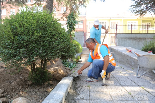 Park ve Bahçeler Müdürlüğüne bağlı ekipler,  Şehit Erdem Öztürk Mesleki ve Teknik Anadolu Lisesi bahçesinde altyapıdan kaynaklı problemleri çözdü. Altyapısı değiştirilen alanda bitkiler ve ağaçlar için sulama hattı çekildi.  Okul bahçesine 400 metrekare parke, 350 metre bordür döşendi. Toprak dolgu çalışmaları yapılan alanda bitki dikimi ve çim ekimi de yapılacak. Ekipler, okul girişindeki merdivenlerin andazit tadilatlarını da gerçekleştirdi.