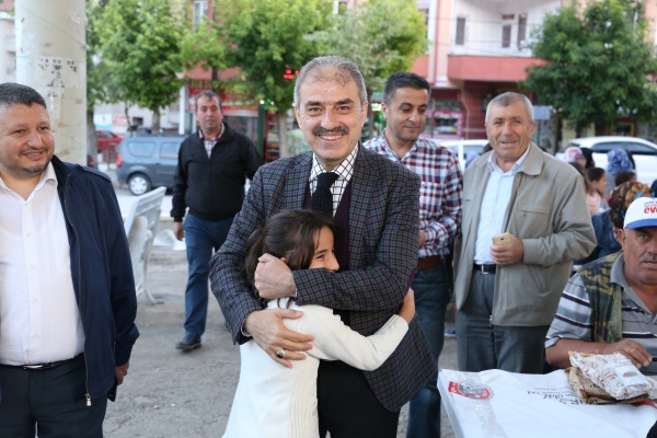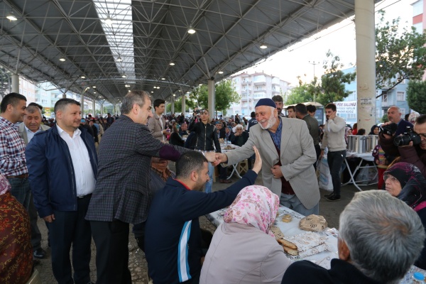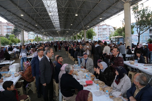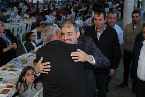 Belediye Başkanı İrfan Dinç, iftar öncesi vatandaşları tek tek selamladı. Vatandaşlar, mahalle iftarından duydukları memnuniyeti dile getirdi. Ezanın okunması ile birlikte iftara katılan vatandaşlar, aynı sofra etrafında oruçlarını açtı. Dinç, “5 bin civarında hemşehrimiz ile birlikteyiz. Gördüğünüz gibi genç ihtiyar çoluk çocuk, hanımefendiler, annelerimiz, kardeşlerimiz, bir aile ortamı içerisinde iftarımızı yapıyoruz. Bundan daha güzel duygu, bundan daha büyük güzellik olabilir mi? Ramazan-ı Şerifin manevi ikliminde onun bu güzelliklerinden feyzinden, bereketinden yararlanma adına hep beraberiz. . Vatandaşlarımızla aynı sofrada buluşmak ve onlarla beraber orucumuzu açmak çok güzel bir duygu. Yoğun katılımları ile Pazar Pazarı iftarımızı bereketlendiren vatandaşlarımıza canı gönülden teşekkür ediyorum. Rabbim tuttuğumuz oruçları kabul eylesin.” dedi.