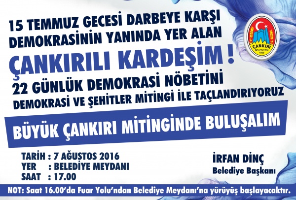 Vatandaşları Pazar günkü mitinge davet eden Belediye Başkanı İrfan Dinç, Çankırılılar olarak büyük bir özveri ile 22 gündür demokrasi nöbeti tutarak ülkeye sahip çıktıklarını belirterek “Demokrasi nöbetini büyük bir mitingle taçlandırmak istiyoruz. Her zaman kendileri ile gurur duyduğum Çankırılı hemşehrilerim Pazar günü belediye meydanını doldurarak demokrasiye ve demokrasi şehitlerine sahip çıktıklarını bir kez daha göstereceklerdir. Yaşlısı genci, kadını erkeği tüm hemşehrilerimi Pazar günü belediye meydanına bekliyoruz” diye konuştu.