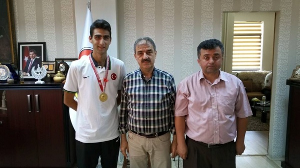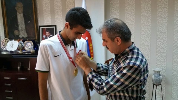 Başkan Dinç daha sonra başarılı genç sporcuyu altınla ödüllendirdi.