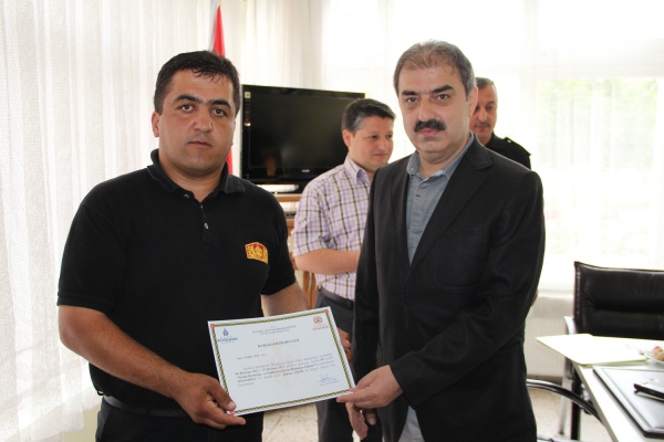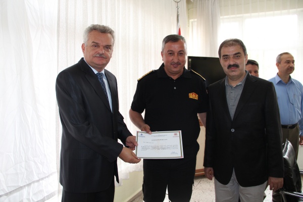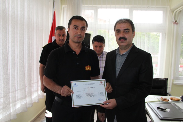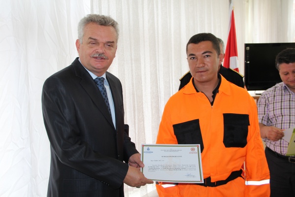 Eğitimi başarıyla tamamlayan itfaiye personeline sertifikaları; Vali Vahdettin Özcan, Belediye Başkanı İrfan Dinç ve başkan yardımcıları tarafından verildi.