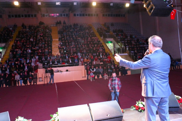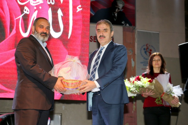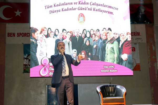 "Hayatın ağır yüklerini taşıyan, elinin emeğini gözünün nuru ile birleştiren, küçük yüreğine kocaman sevgiler sığdıran, güçsüz bedenlerin kahramanları kadınlar" sözleri ile başlayan programda konuşma yapan Belediye Başkanı İrfan Dinç, salondaki vatandaşları selamlayarak bütün kadınların 8 Mart Dünya Kadınlar Günü'nü kutladı. "Gelecek hanım efendilerin hünerli ellerinde şekillenir" sözleri ile konuşmasına başlayan Başkan Dinç, "Bu söz sadece bir retorik olarak söylemenin ötesinde, bu sözün gerektirdiği ölçüde elindeki imkanları bu sözün gerekliliğini yerine getirmek üzere en sonuna kadar kullanan bir kardeşinizim. Bu gün itibari ile nüfusumuz 79 bin olmasına rağmen sekiz adet kadın merkezimiz var. İki tanesi de çok özel bir merkez. Bunlardan birtanesi Kadın Eğitim Kültür Merkezimiz; bir diğeri de Kadın İstihdam Merkezimiz. Biz bizi yaradanın kadınlarımıza vermiş olduğu değer üzerine bir çizgide ilerliyoruz" ifadelerini kullandı.