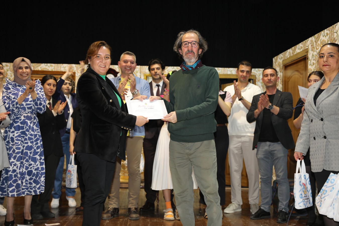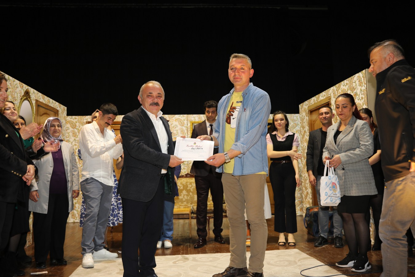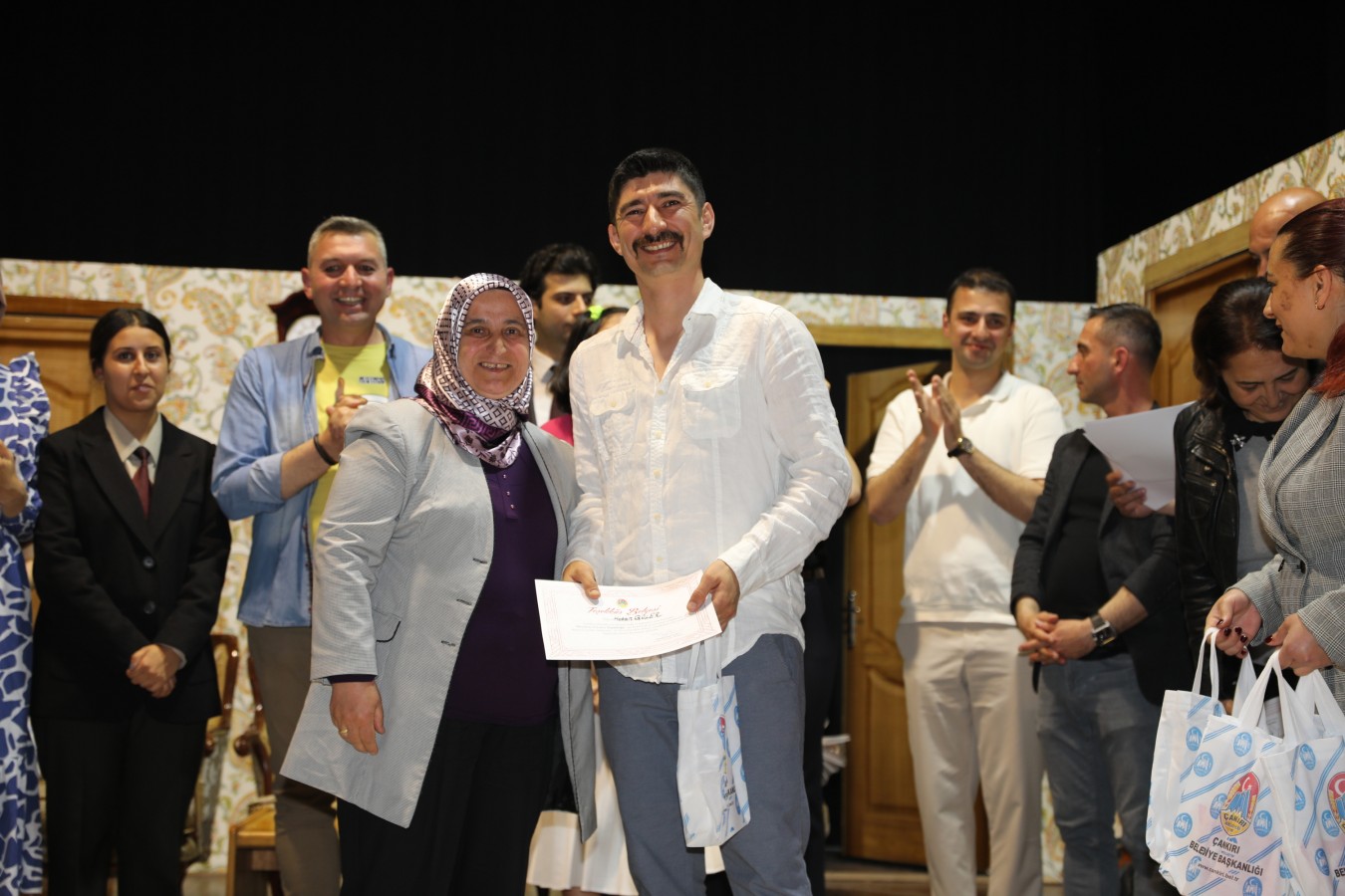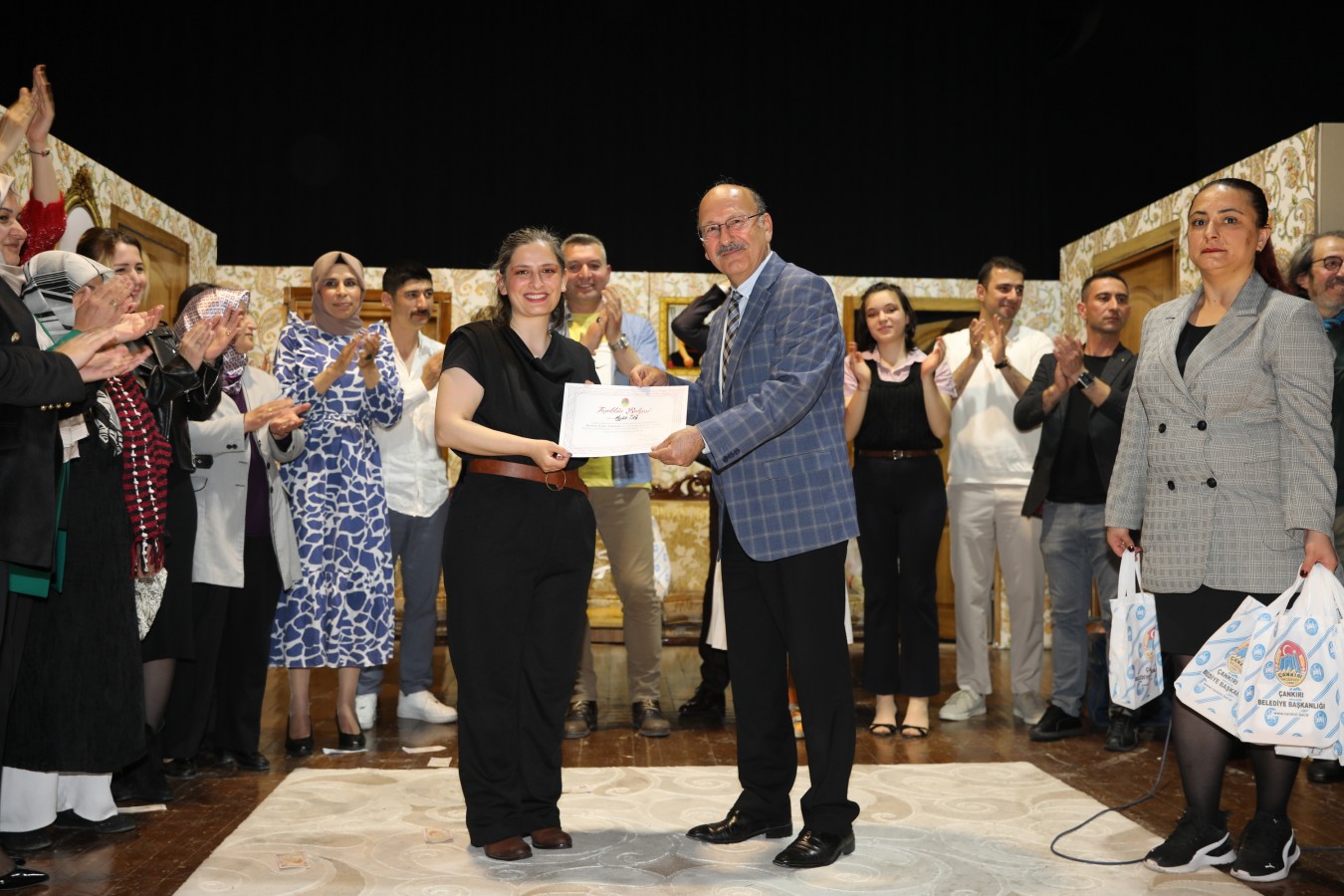 Oyunculara teşekkür belgelerini Belediye Başkanı İsmail Hakkı Esen ve protokol takdim etti. Başkan Esen, Çankırı Belediyesi bünyesinde oluşturdukları tiyatro topluluğunun önemli yetenekler çıkartacağını ilk performansları ile gördüklerini söyleyerek, bu topluluğun çalışmalarının aktif bir şekilde sürdüreceklerini belirtti. Çankırı halkını sosyal ve kültürel faaliyetler ile daha çok buluşturacaklarını ifade eden Esen, salonu dolduran vatandaşlara, keyifli bir oyun sahneleyen oyunculara ve emeği geçen herkese teşekkür etti.