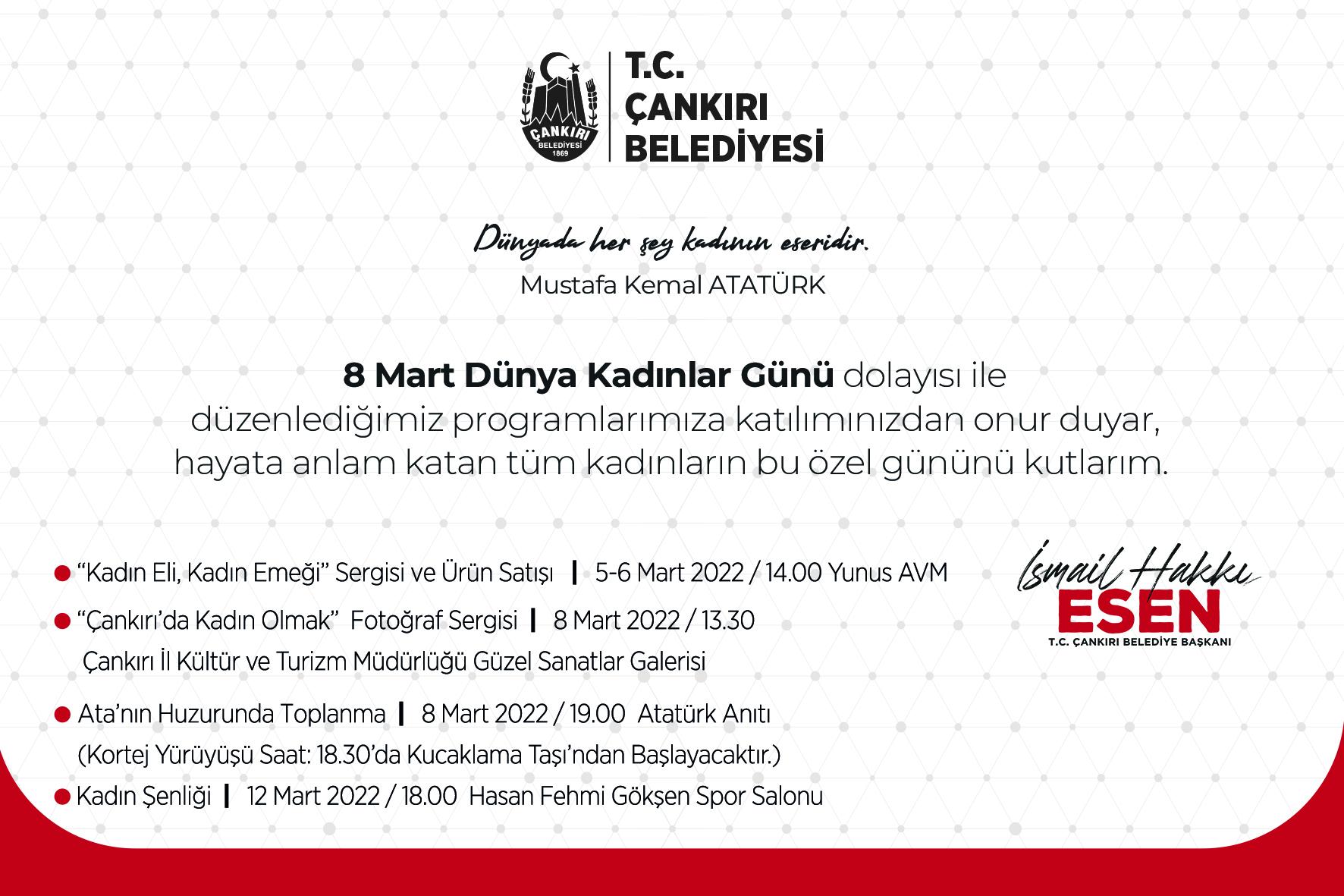 Belediye Başkanı İsmail Hakkı Esen, tüm kadınların Dünya Kadınlar Günü’nü kutlayarak Çankırı’da yaşayan tüm kadınları etkinliklere davet etti. Etkinliklerin diğer bölümlerinin ise 8 Mart’ta kadın personele idari izin kullandırılması, kadın personel ile kahvaltı programı, kurum, halk ve esnaf ziyaretlerinden oluştuğu bildirildi.