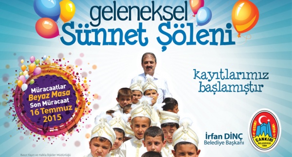 “Geleneksel Sünnet Şöleni”nde çocuklarını sünnet ettirmek isteyen aileler, 16 Temmuz 2015 Perşembe günü mesai bitimine kadar Belediye Beyaz Masa birimine başvuru yapabilecekler. Çankırı il sınırları içerisinde ikamet etme şartı aranan başvurularda; anne veya babanın ve çocuğun kimlik fotokopisi, çocuğa ait 2 adet fotoğraf ve sünnet kayıt formunun doldurularak görevlilere eksiksiz teslim edilmesi gerekiyor.