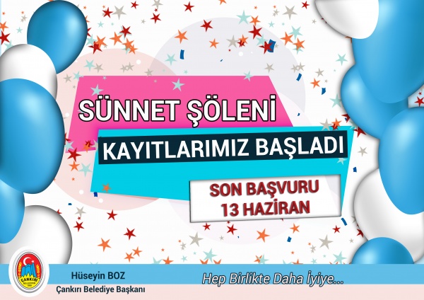 Çankırı Belediyesi'nin ihtiyaç sahibi aileler için geleneksel olarak düzenlediği sünnet şöleni için kayıtlar başladı. Çocuklarını sünnet ettirmek isteyen aileler, çocuklarına ve kendilerine ait nüfus cüzdanı fotokopisi, çocuğa ait bir adet fotoğraf ve Beyaz Masa’dan dolduracakları form ile 13 Haziran 2018 Çarşamba günü mesai bitimine kadar sünnet için kayıt yaptırabilecek. Çocukların sünnet kıyafetleri Çankırı Belediyesi tarafından tedarik edilecek. Belediye Başkanı Hüseyin Boz, sünnet olacak çocukların heyecanına ve ailelerinin de mutluluğuna ortak olmak istediklerini belirterek özellikle dar gelirli ailelere böylesine özel bir günde destek olmak istediklerini ifade etti.