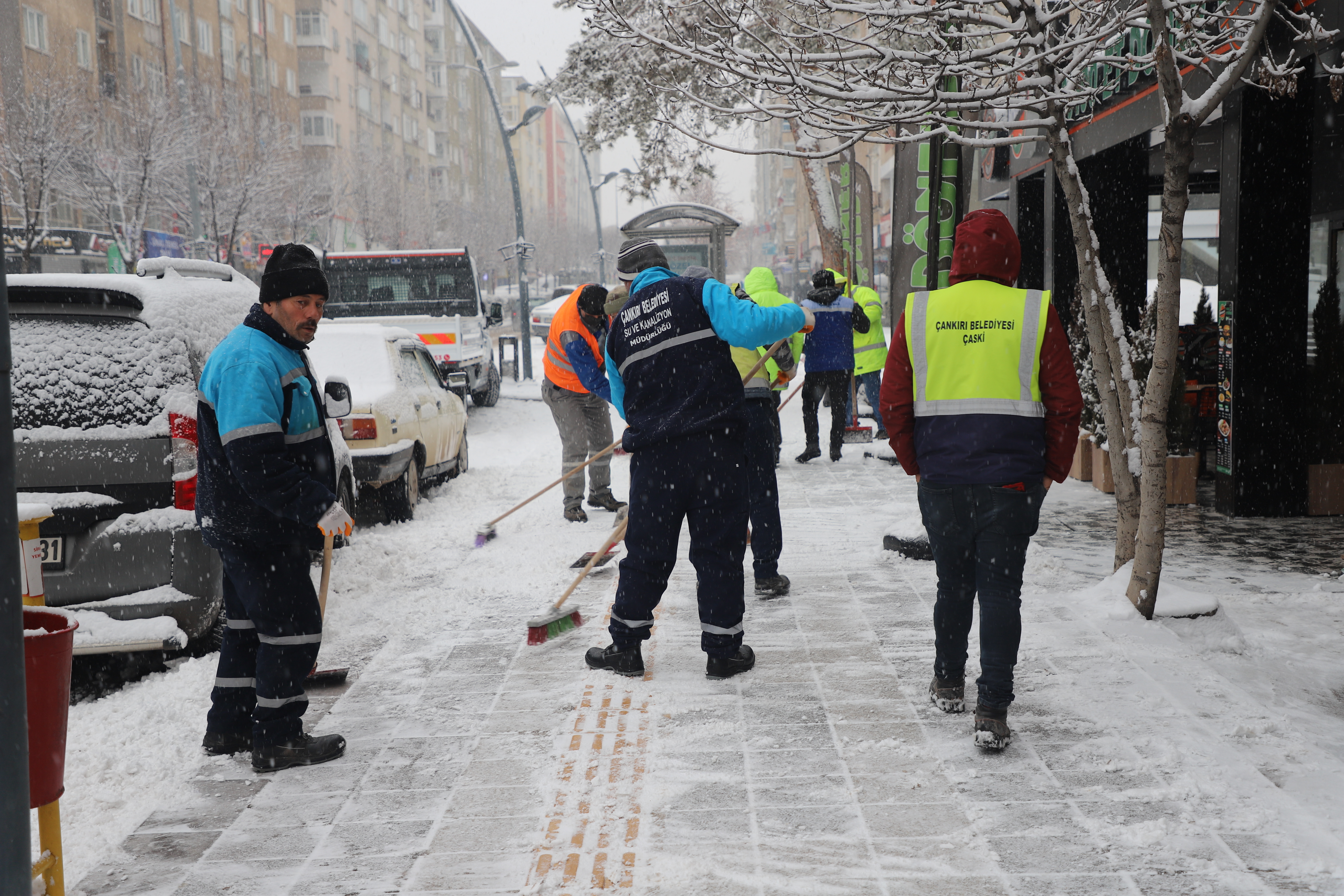 Meteoroloji Genel Müdürlüğünün yoğun kar yağışı ve buzlanma uyarısı yaptığı Çankırı'da, Belediye ekipleri teyakkuza geçti. Ekipler, Cuma günü başlayan kar yağışının ardından araç ve yaya trafiğini açık tutmak, buzlanmayı ve olası kazaları önlemek için çalışmalarını 7/24 sürdürdü.