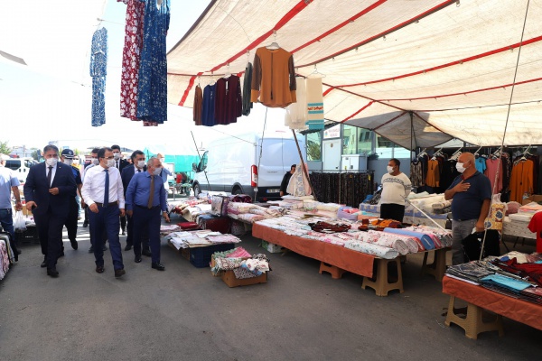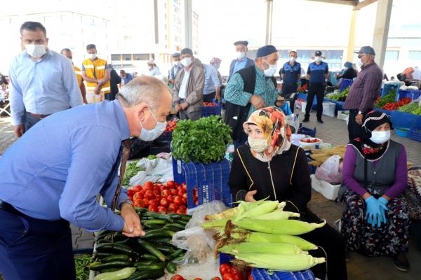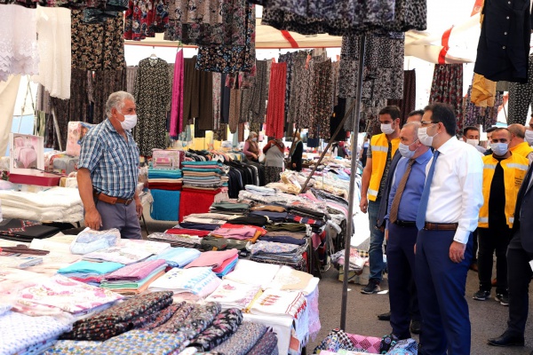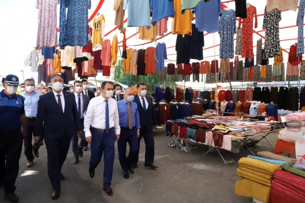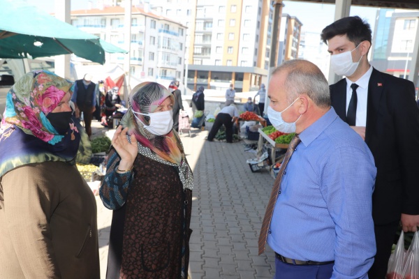 Çankırı’da pandemi sürecinde zabıta ekipleri tarafından denetimleri sıklaştırılan Çarşamba Pazarı’nda yapılan son denetime Çankırı Valisi Abdullah Ayaz ve Belediye Başkanı İsmail Hakkı Esen de katıldı. Pazar esnafını tek tek ziyaret eden heyet, alışveriş için pazar alanına gelen vatandaşları da uyardı. Vali Ayaz, vatandaşların çoğunluğunun maske taktığını görmenin sevindirici olduğunu söylerken Başkan Esen ise Çankırı halkının maske kullanımı konusunda hassas davrandığı sürece özlenen eski günlere daha çabuk dönüleceğini vurguladı.
