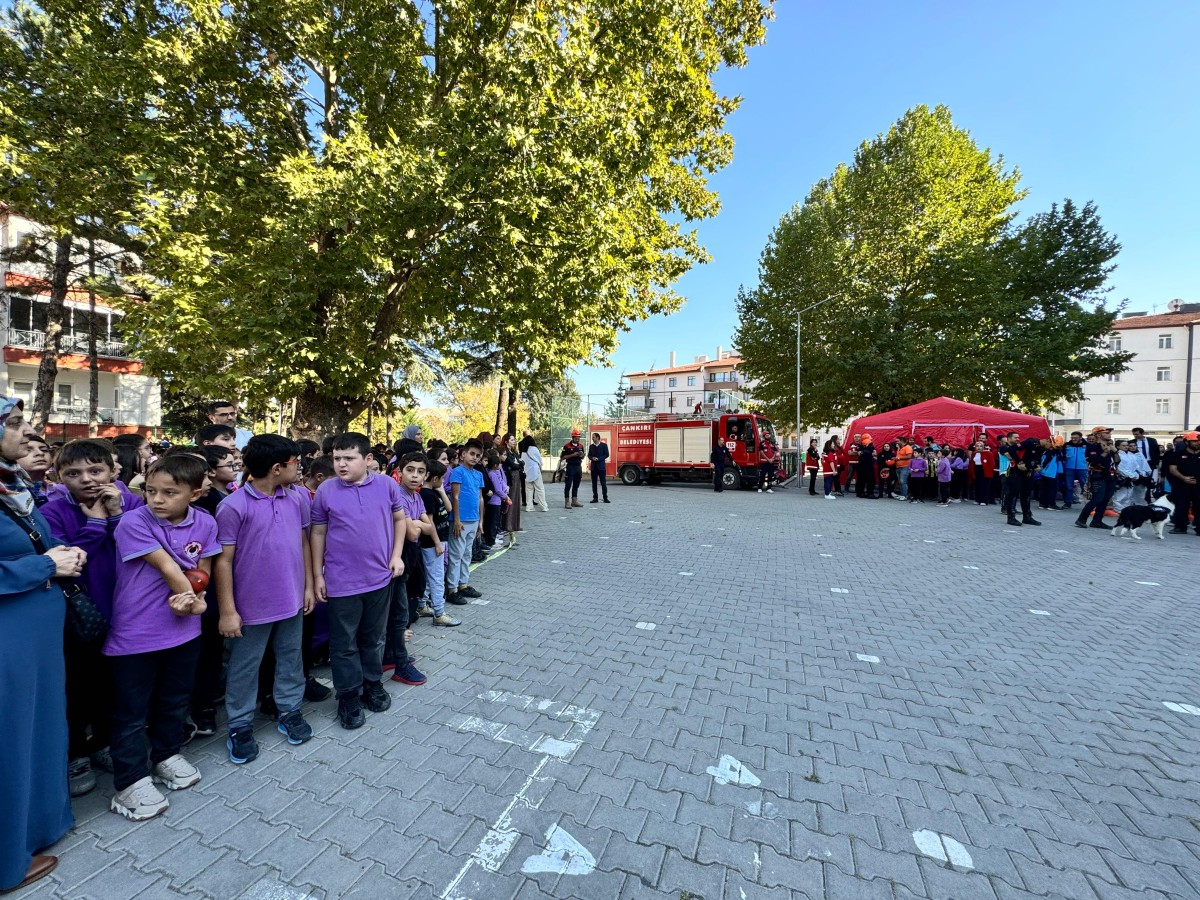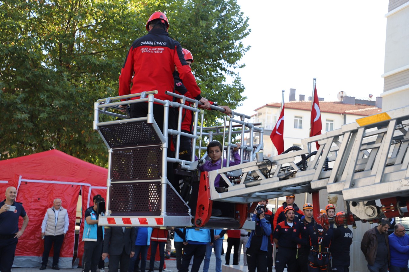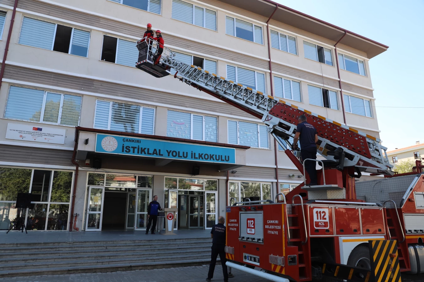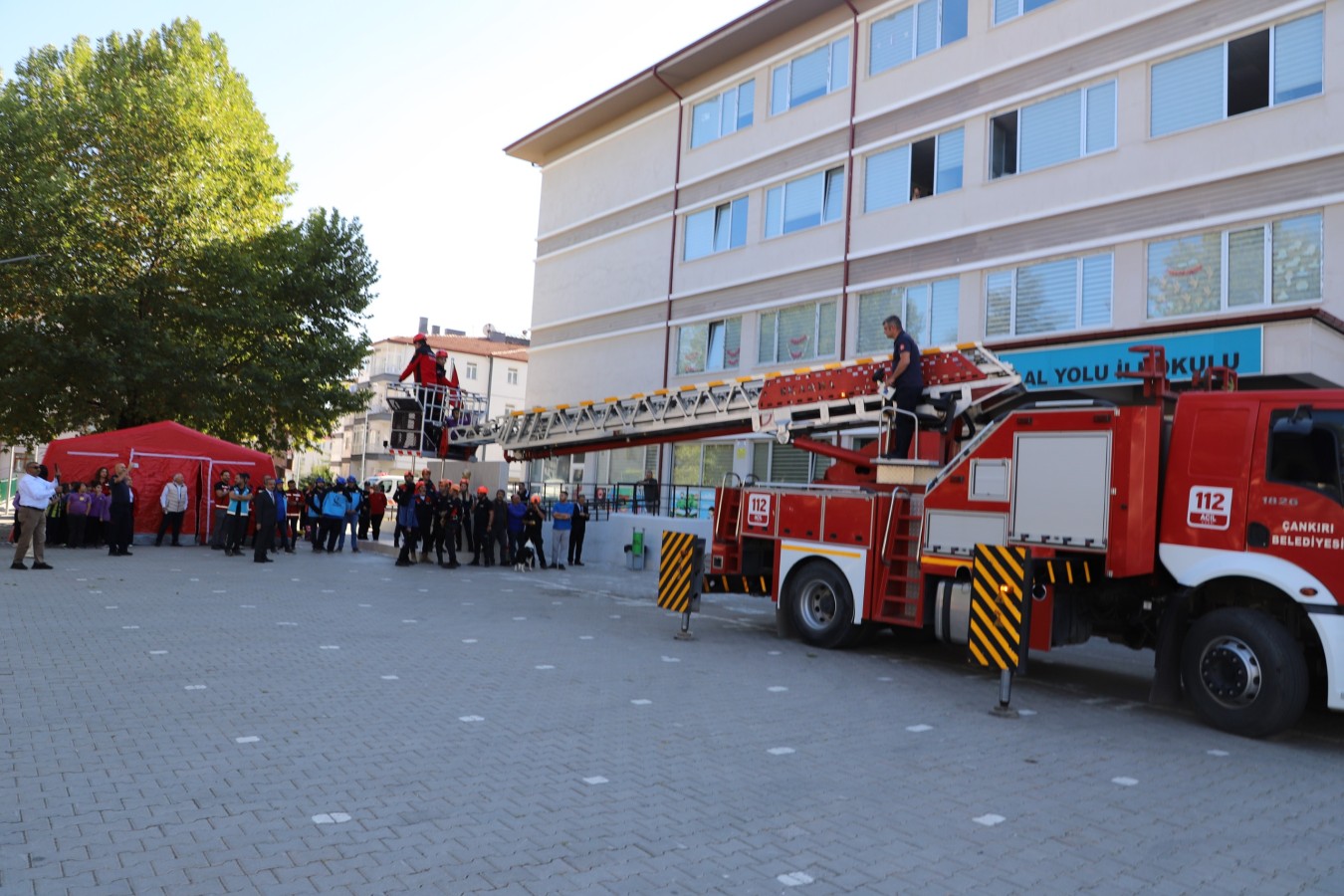 Sirenler bu kez Çankırı İstiklal Yolu İlkokulu bahçesinde çaldı. Tatbikata katılan yüzlerce öğrenci, afet esnasında nasıl davranacaklarını ve yardıma gelen ekiplerin neler yapacağını uygulamalı olarak tatbik etti. Çankırı Belediyesi İtfaiye Müdürlüğü ekiplerinin de araç, gereç ve donanımları ile hazır beklediği tatbikatta yaralı çıkarma, merdivenli araçla yüksekten yaralı indirme, yangın söndürme ve tahliye etme alanlarında uygulama ve kurtarma çalışmaları yapıldı.