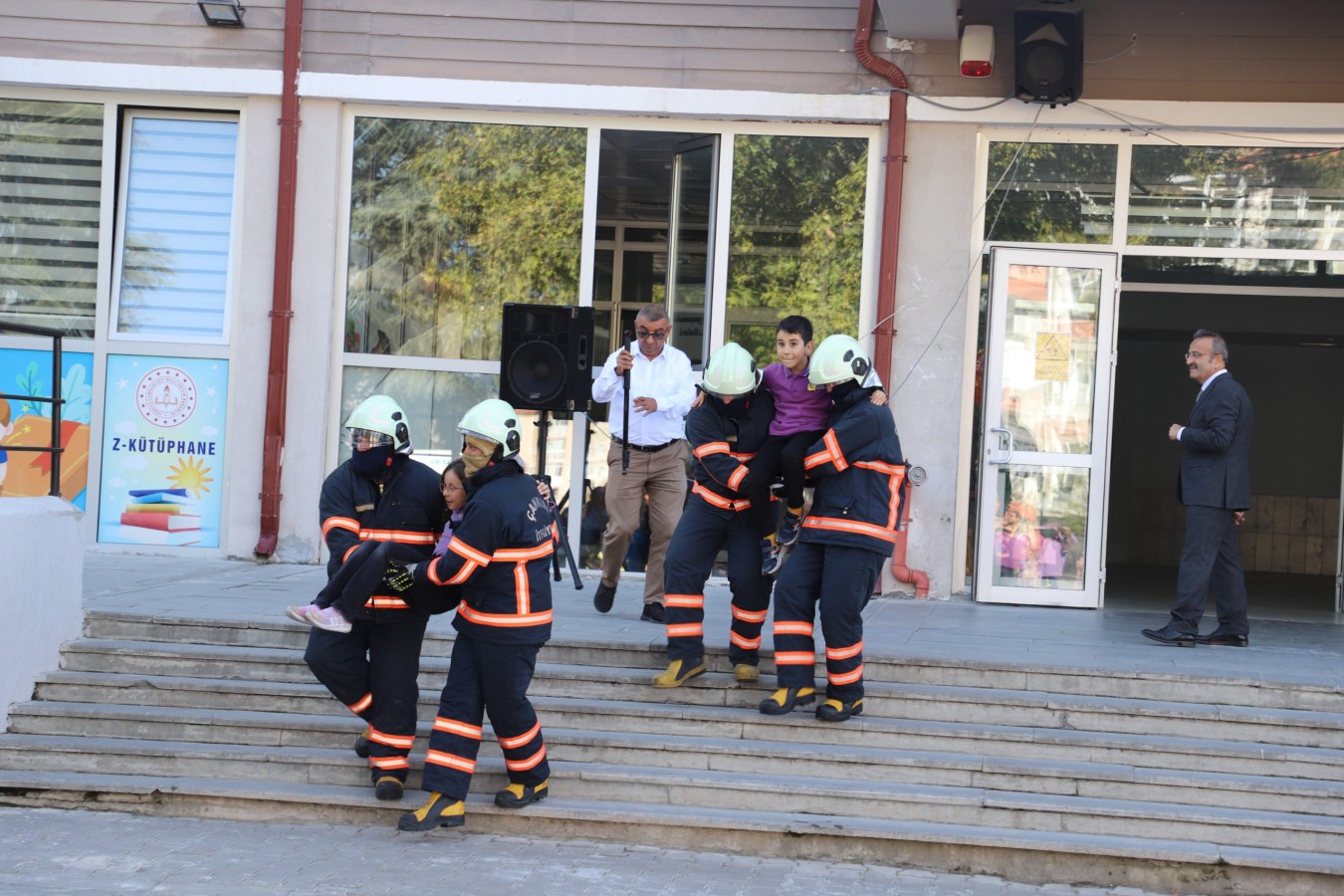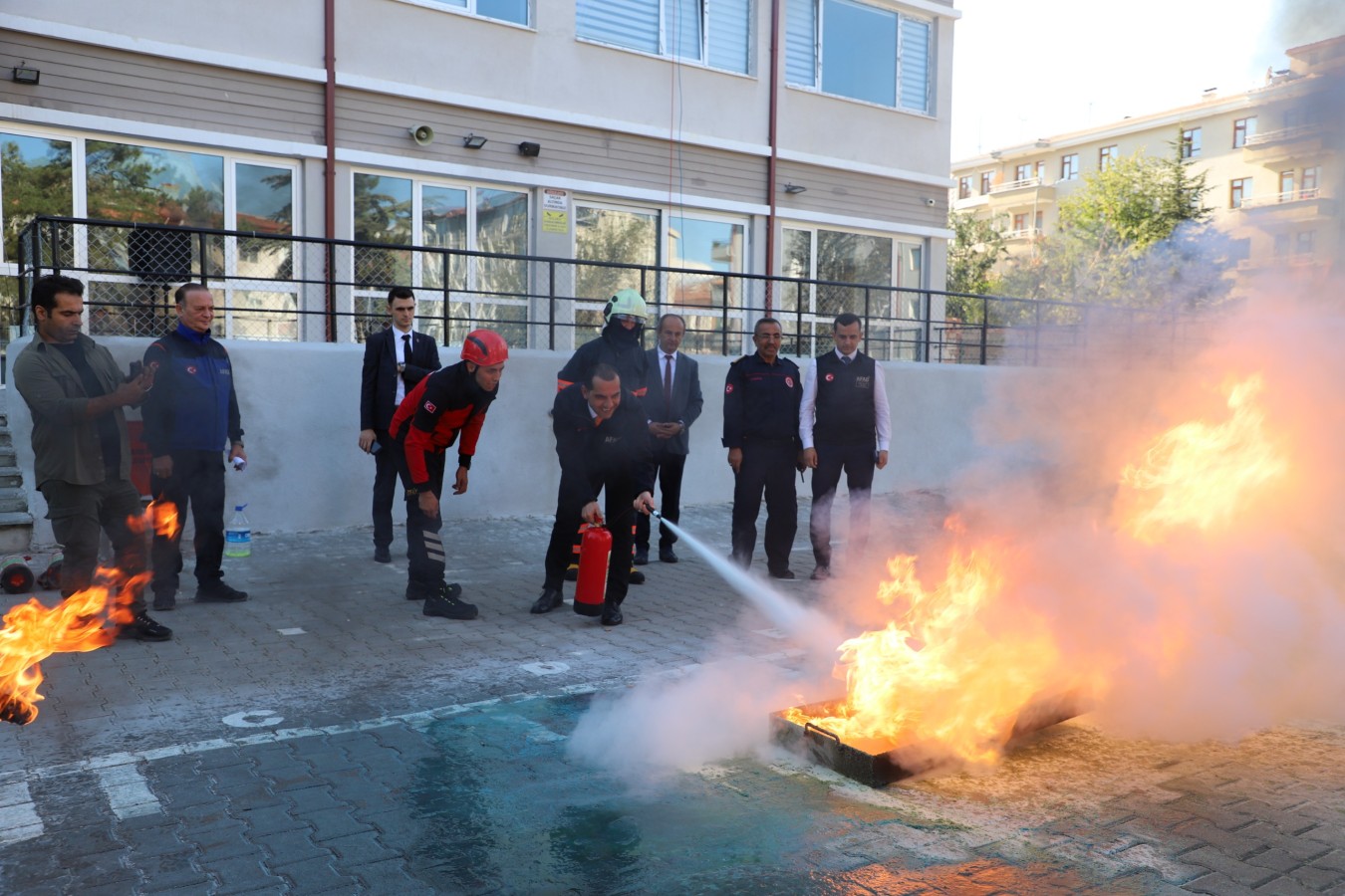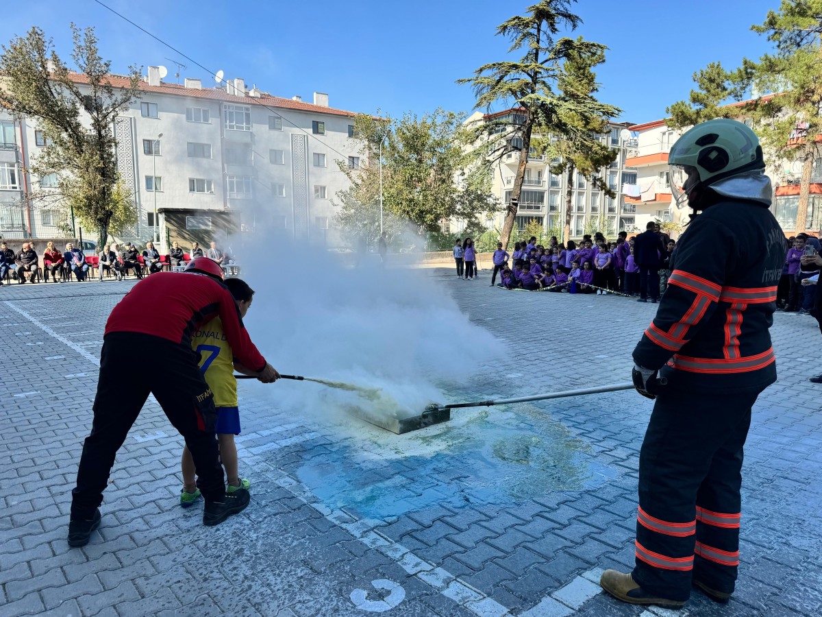 Tatbikat sonunda çocuklara yangın söndürme ile ilgili uygulamalı eğitim verildi.