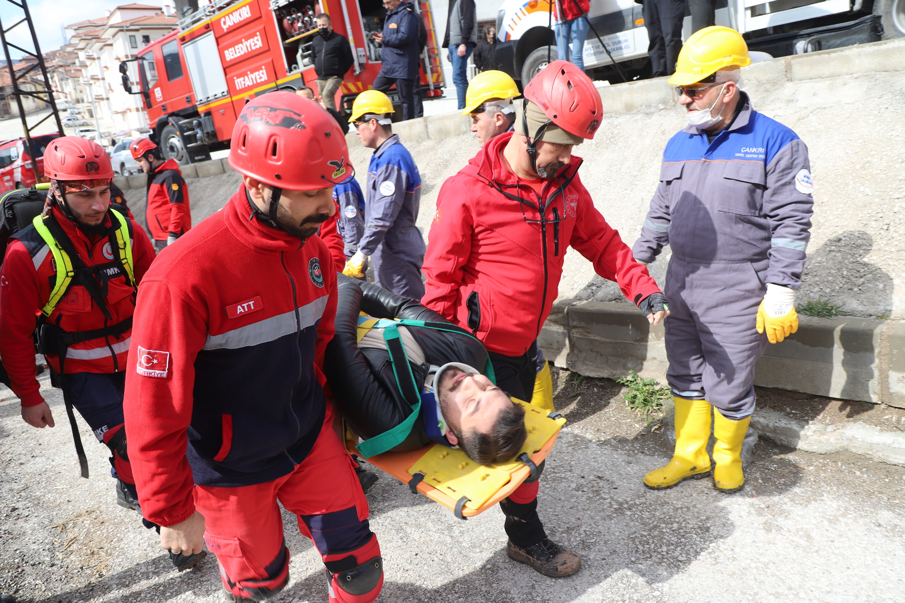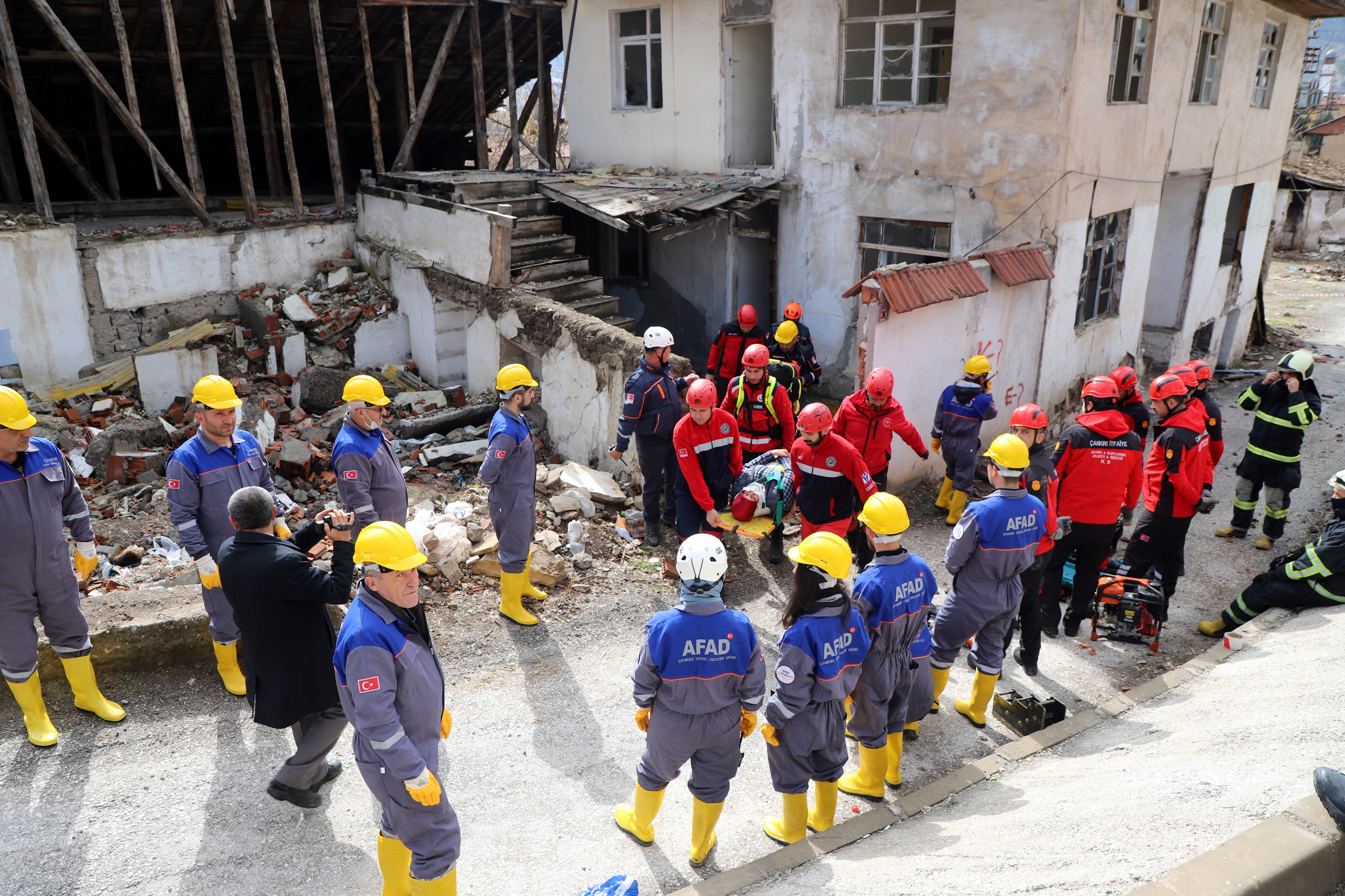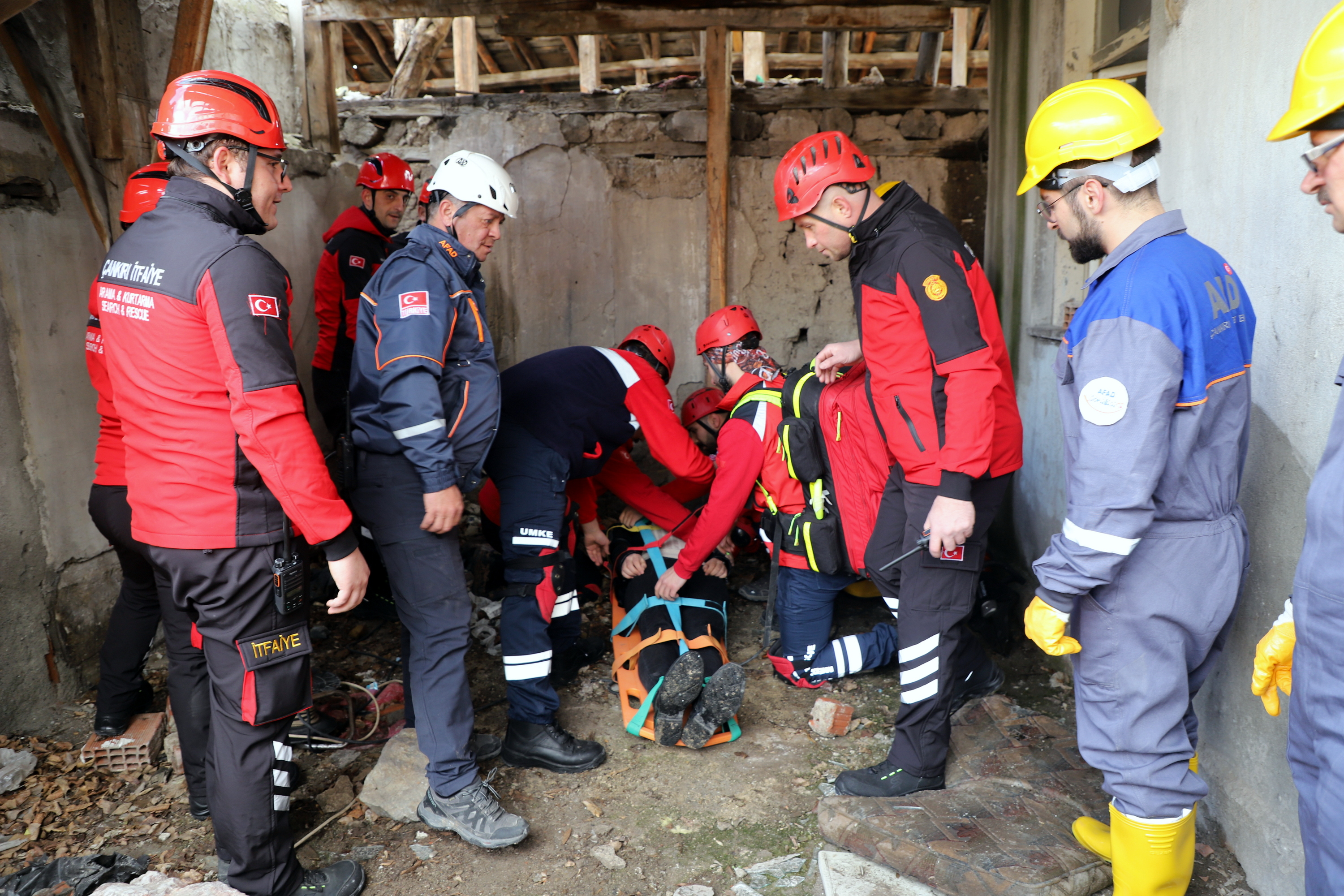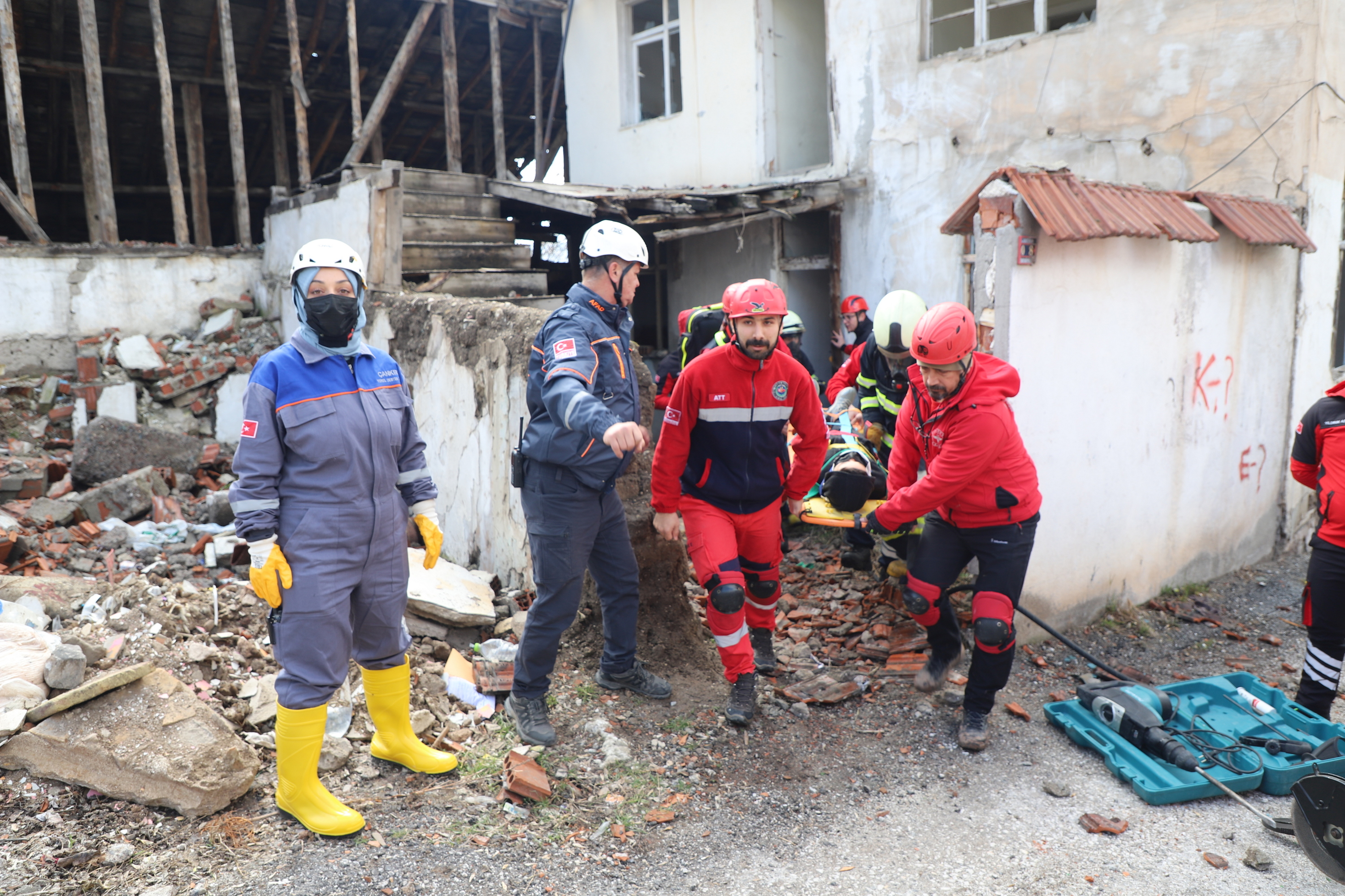 Çankırı’da ekipler alarma geçti. Senaryo gereği Çankırı Eldivan ilçesi Çiftlikköy yakınlarında 7.2 büyüklüğünde meydana gelen depremde merkezde yıkılan binada arama kurtarma çalışmaları başlatıldı. 112 Acil Çağrı Merkezine gelen ihbar üzerine acilen enkaz bölgesine sevk edilen İl Afet ve Acil Durum Müdürlüğü, Çankırı Belediyesi İtfaiye Müdürlüğü, Ulusal Medikal Kurtarma Ekipleri (UMKE) ve İl Emniyet Müdürlüğü ekipleri ortaklaşa arama ve kurtarma çalışmalarına başladı. Tatbikata arama kurtarma köpeği de katıldı. Deprem sonrası göçük altında kalan iki vatandaşın yerleri tespit edilerek yaralı olarak kurtarıldı. Tatbikat, ekiplerin ortak çalışması ile başarılı bir şekilde tamamlandı.
