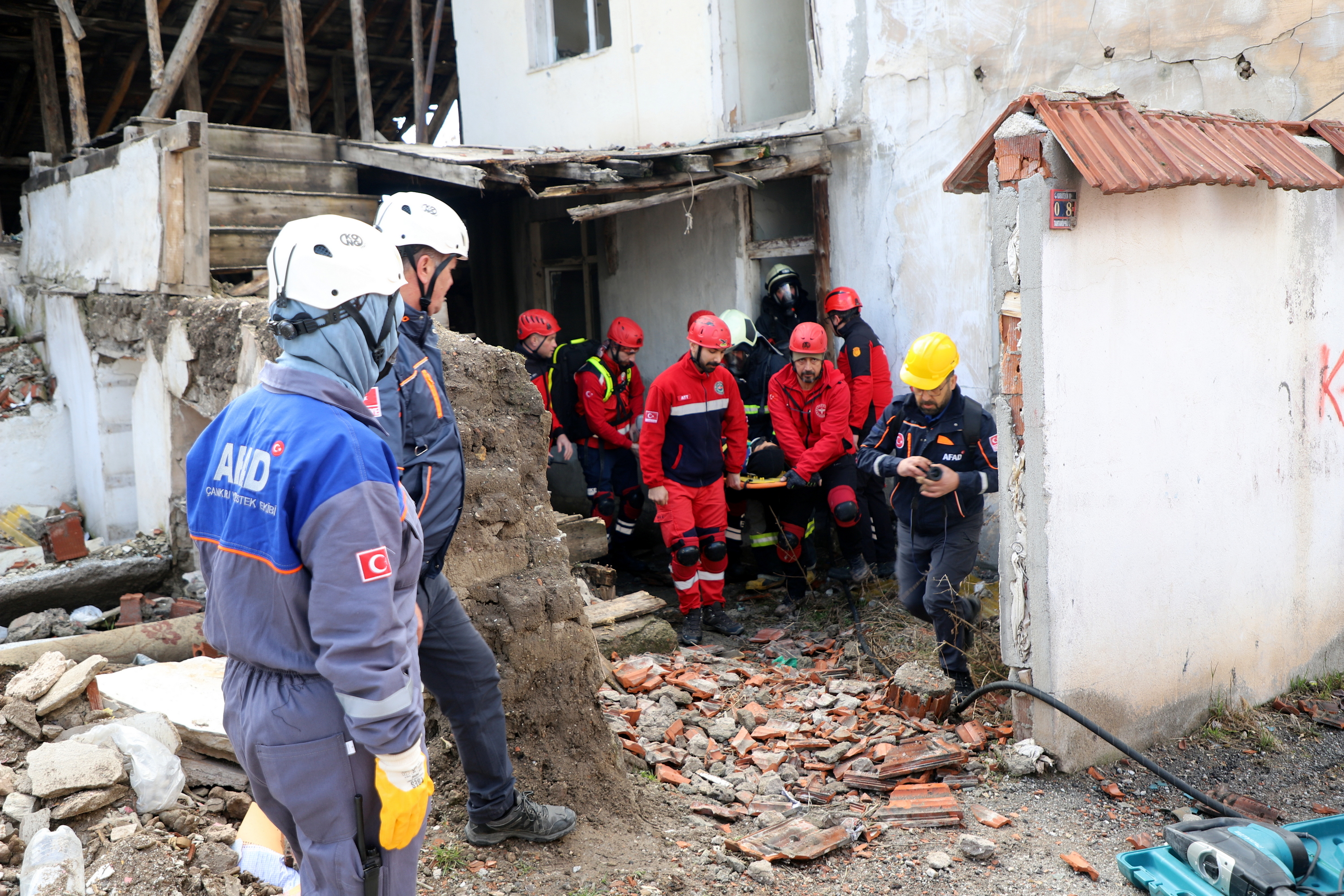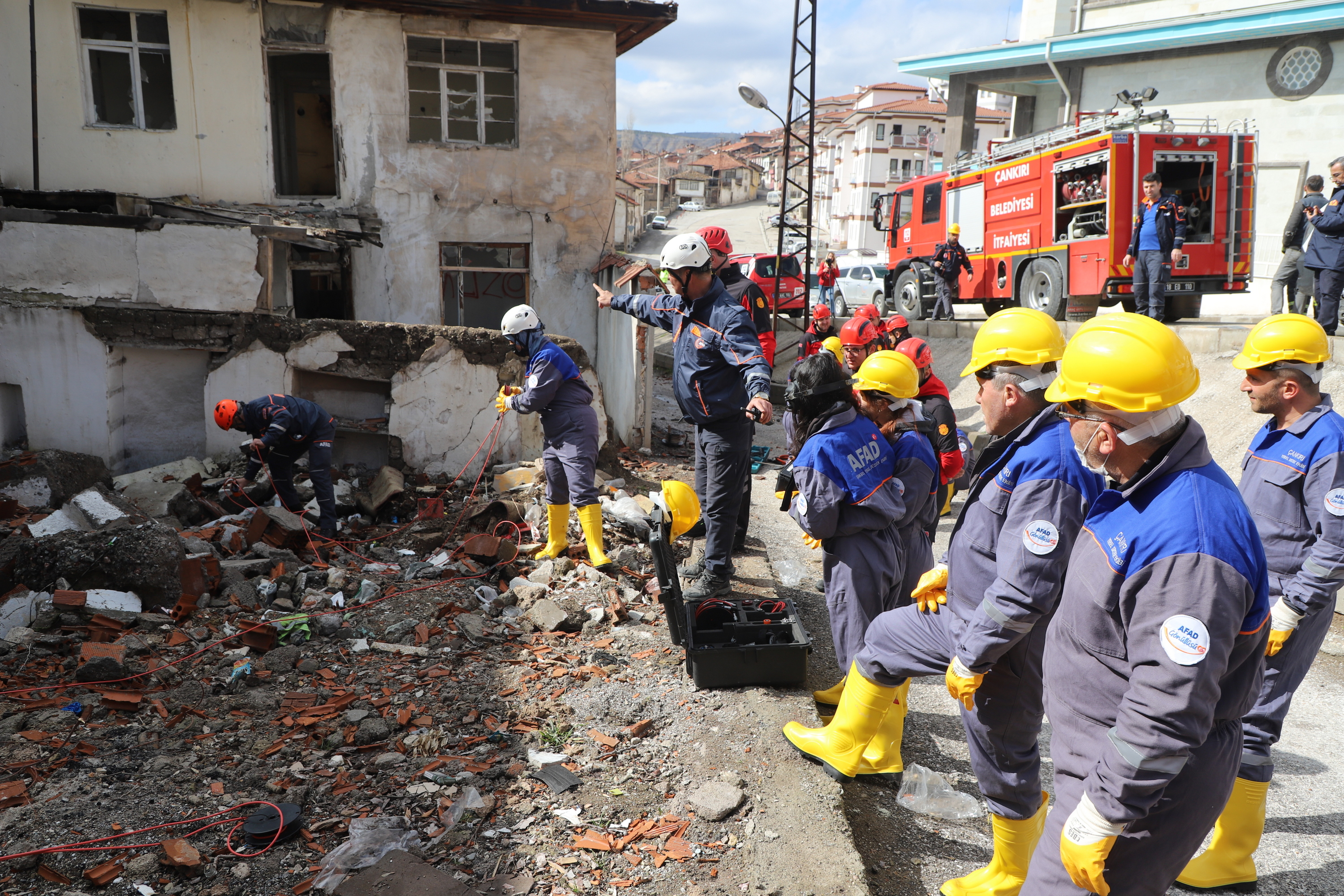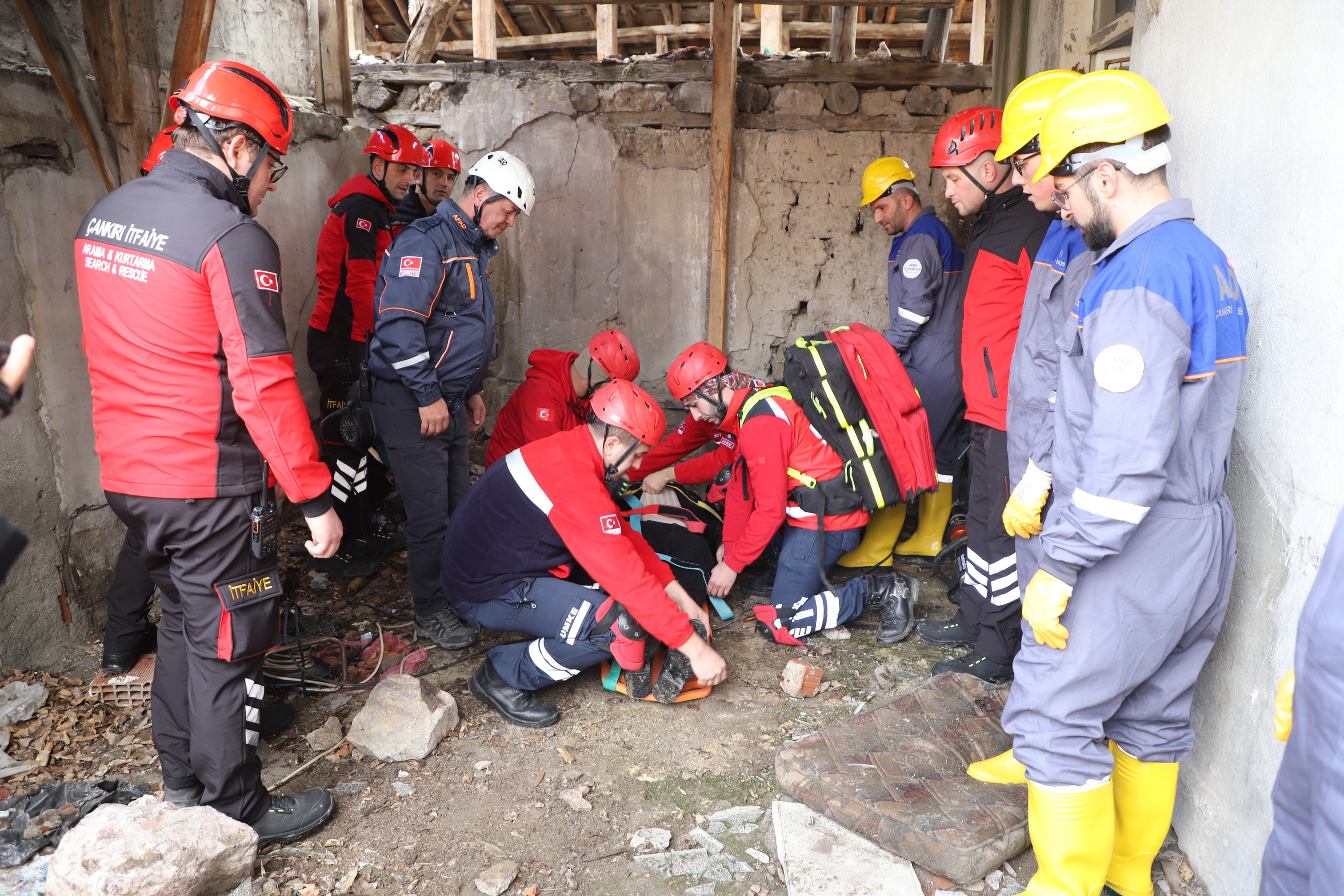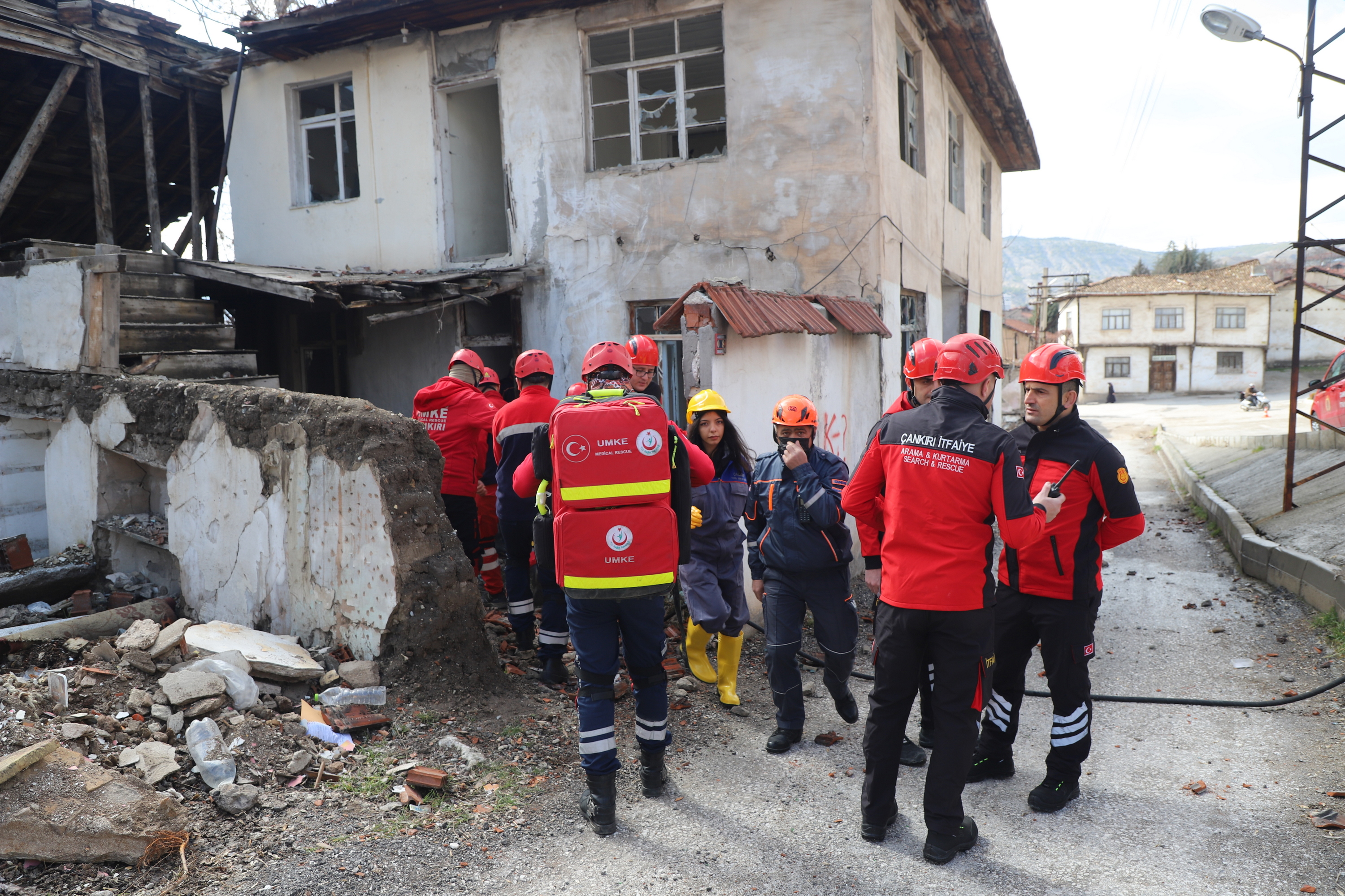 Çankırı’da ekipler alarma geçti. Senaryo gereği Çankırı Eldivan ilçesi Çiftlikköy yakınlarında 7.2 büyüklüğünde meydana gelen depremde merkezde yıkılan binada arama kurtarma çalışmaları başlatıldı. 112 Acil Çağrı Merkezine gelen ihbar üzerine acilen enkaz bölgesine sevk edilen İl Afet ve Acil Durum Müdürlüğü, Çankırı Belediyesi İtfaiye Müdürlüğü, Ulusal Medikal Kurtarma Ekipleri (UMKE) ve İl Emniyet Müdürlüğü ekipleri ortaklaşa arama ve kurtarma çalışmalarına başladı. Tatbikata arama kurtarma köpeği de katıldı. Deprem sonrası göçük altında kalan iki vatandaşın yerleri tespit edilerek yaralı olarak kurtarıldı. Tatbikat, ekiplerin ortak çalışması ile başarılı bir şekilde tamamlandı.