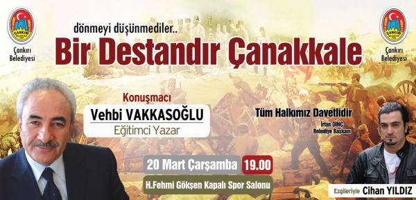 Çankırı Belediyesi'nin 18 Mart Çanakkale Zaferi'nin  98. yıldönümü etkinlikleri kapsamında düzenlediği gece, 20 Mart Çarşamba günü saat 19.00'da Hasan Fehmi Gökşen Kapalı Spor salonunda yapılacak.  Eğitimci-yazar Vehbi Vakkasoğlu'nun konuşma olarak katılacağı programa ezgileriyle Cihan Yıldız eşlik edecek.