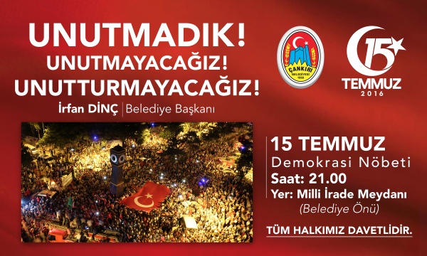 Türkiye'nin milli birlik ve beraberliğini hedef alan Fetullahçı Terör Örgütü'nün 15 Temmuz 2016'daki hain darbe girişimine karşı Türk halkının kahramanca verdiği mücadelenin birinci yılında Çankırı’daki etkinlikler de tüm hızıyla sürüyor. 15 Temmuz Cumartesi günü saat 20.00’de Kucaklama Taşından itibaren başlayacak yürüyüşün ardından Milli İrade Meydanında (Belediye Önü) bir araya gelecek Çankırılılar, Pazar akşamı saat 24.00’e kadar vatan nöbeti tutacak. Meydana kurulan sahnede sinevizyon gösterileri yer alırken; şehitler için de Kuran Tilavetleri ve ilahiler okunacak. Çankırılıların şehitler için okuduğu Yasin-i Şeriflerin hatim duası da meydan da yapılacak.