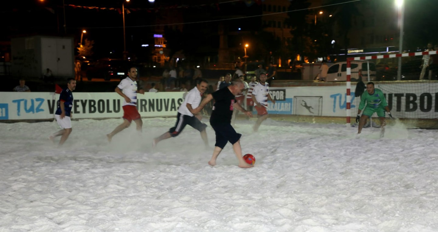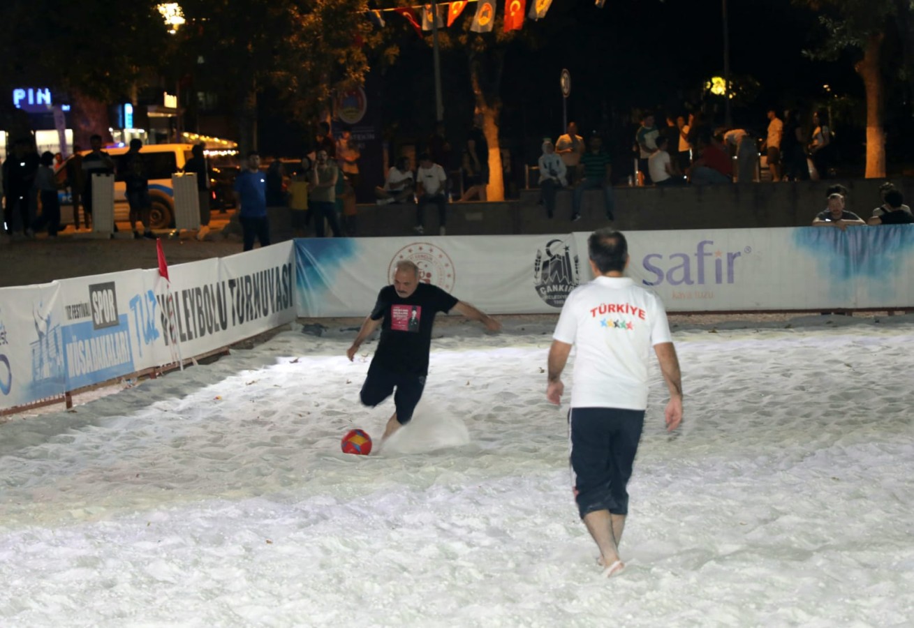 Çankırı’nın yerel yönetimi tuz üzerinde kıyasıya mücadele verdi. Vali Abdullah Ayaz ile Belediye Başkanı İsmail Hakkı Esen’in takım kaptanlığını üstlendiği gruplar, tuzdan sahada futbol oynadı.
