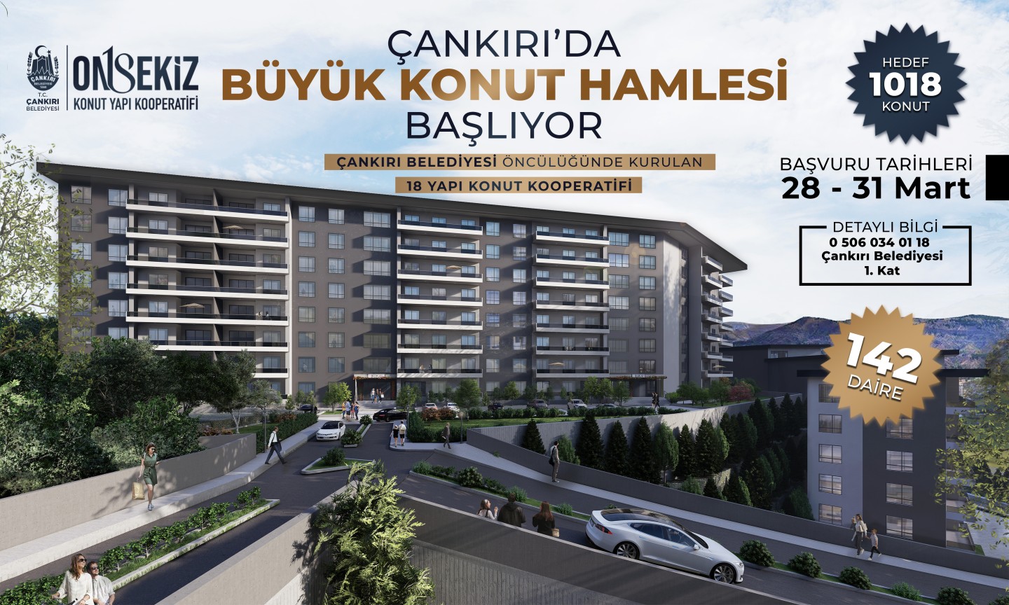 Çankırı Belediye Başkanı İsmail Hakkı Esen’in talimatı ile kurulan 18 Konut Yapı Kooperatifi, vatandaşların konut sıkıntısını çözmek için konut hamlesi başlattı. Çankırı tarihinin en büyük sosyal konut projesi için başvurular başladı. Ev sahibi olmak isteyen vatandaşlar, 31 Mart’a kadar Belediye Hizmet Binası birinci katta bulunan kooperatif bürosuna bizzat müracaat edebilecek.