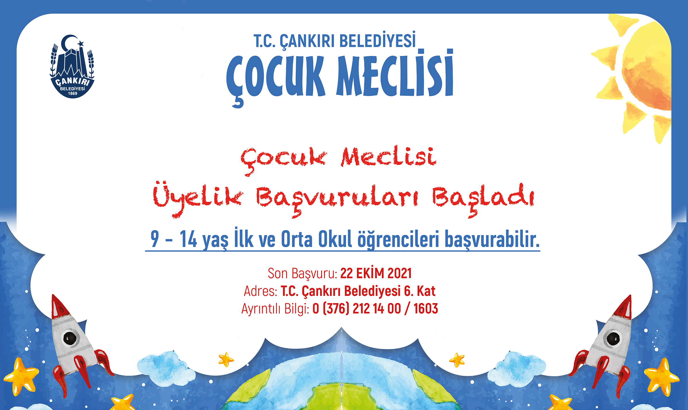 Çankırı Belediyesi Çocuk Meclisinin 18. dönem başvuruları başladı. 22 Ekim Cuma günü mesai bitimine kadar sürecek başvurular, Belediyenin 6. katında bulunan Çocuk Meclisi birimine yapılacak.