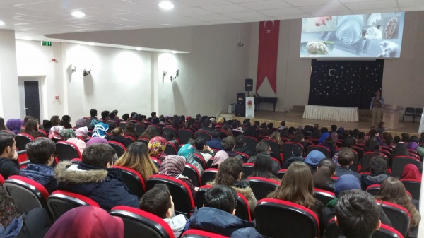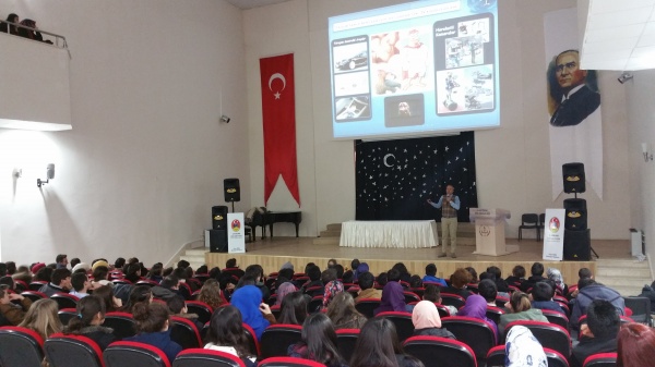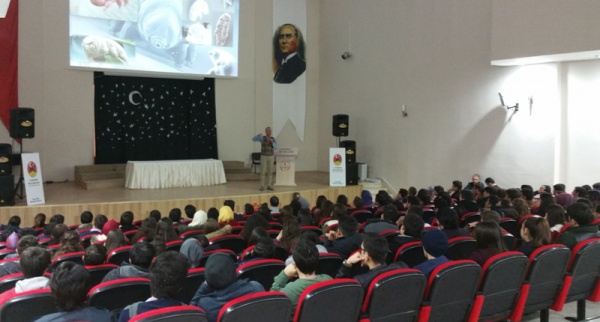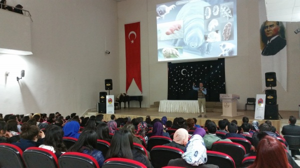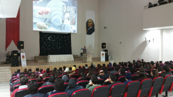 Doğa Bilimleri Dernek Başkanı Altuğ Revnak Eti ve Bilim Adamı Turgut Aksu’nun konuşmacı olarak katıldığı konferansta; canlı doğanın konseptlerinin çözülerek teknolojide uygulanması anlamına gelen biyomimetikten örnekler verildi. Doğayı korumak için önce onu tanımak gerektiğini belirten Altuğ Revnak Eti, doğadaki canlıların ve tasarımların teknolojiye nasıl ilham kaynağı olduğunu ve nasıl kullanıldığını anlattı. Canlıların üzerinde teknojiye uyarlanabilecek çok donanım ve yazılım bilgisinin olduğuna dikkat çeken Eti, yaptığı görsel sunumda canlılardan faydalanılarak üretilen cihazlara örnekler vererek, “ ‘Harika fikirler her yerde!’ bakış açısı konunun ana fikri. Çünkü etrafınıza baktığınız zaman fikirler hazine gibi karşımızda duruyor ve onları alıp kullanmanız gerekiyor. Her canlıda teknolojimiz için kullanabileceğimiz teknolojiler mevcut. Onlar kendilerinde var olan bu teknolojiyi dünyayı bozmadan kullanıyorlar, bunu biz de yapabiliriz. Dünyayı ekosistem açısından da kurtaracak olan; fikir insanlarıdır, vizyonu geniş bilim insanlarıdır.” ifadelerine yer verdi.