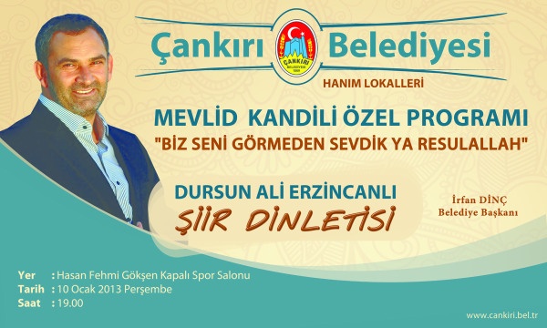 Pegamber Efendimiz(s.a.v)in dünyaya tefrişlerinin 1442. yıldönümü vesilesiyle 10 Ocak Perşembe günü saat 19.00’da Hasan Fehmi Gökşen Spor Salonu’nda Dursun Ali Erzincanlı’nın şiir dinletisi eşliğinde gerçekleştirilecek “Mevlid Kandili Özel Programı”na tüm halkımız davetlidir.