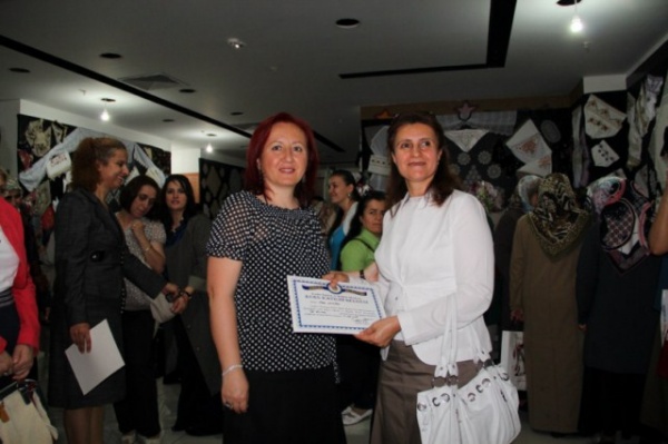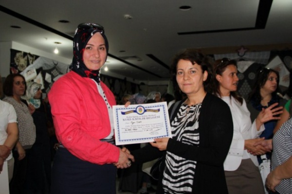 Başkan Dinç’in eşi Zeynep Dinç, İl Jandarma Komutanı eşi Birsen Melül ve Emniyet Müdürü eşi Hatice Zoroğlu tarafından, Kadın Eğitim ve Kültür Merkezi bünyesinde verilen kurslara katılan kursiyerlere sertifikaları verilerek hatıra fotoğrafları çektirildi.