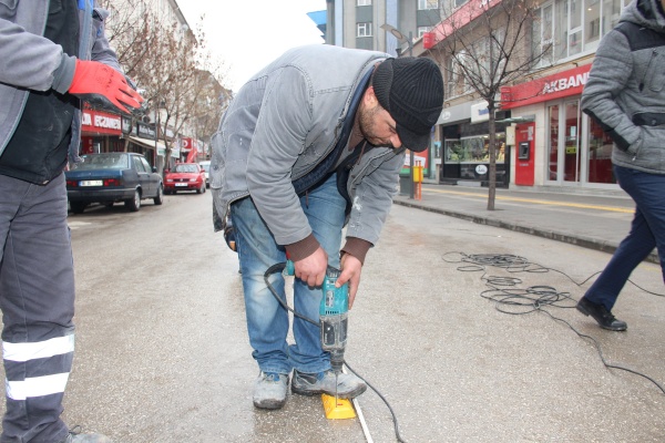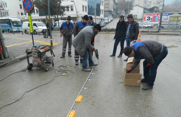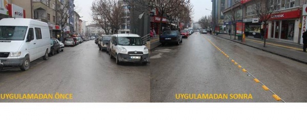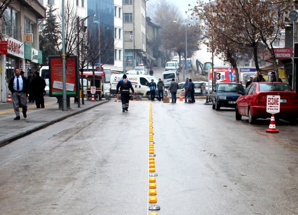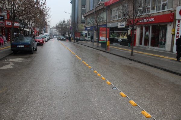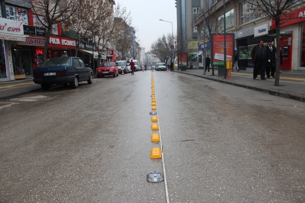 İki taraflı araç parkının önüne geçmek için Belediye Zabıta Müdürlüğü işbirliği ile çalışmaları hızlandıran Belediye Fen İşleri Müdürlüğüne bağlı ekipler, araç trafiğini rahatlatmak için yol butonu monte çalışmalarına başladı. Sarı yol butonları ile yolu 4’er metre olmak üzere ikiye bölen ekipler, yolun sadece bir tarafında tek sıranın araç parkı olarak kullanılması için 2 metre genişliğinde cepler bıraktı.