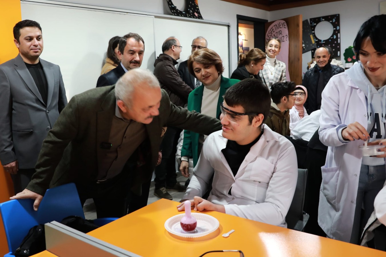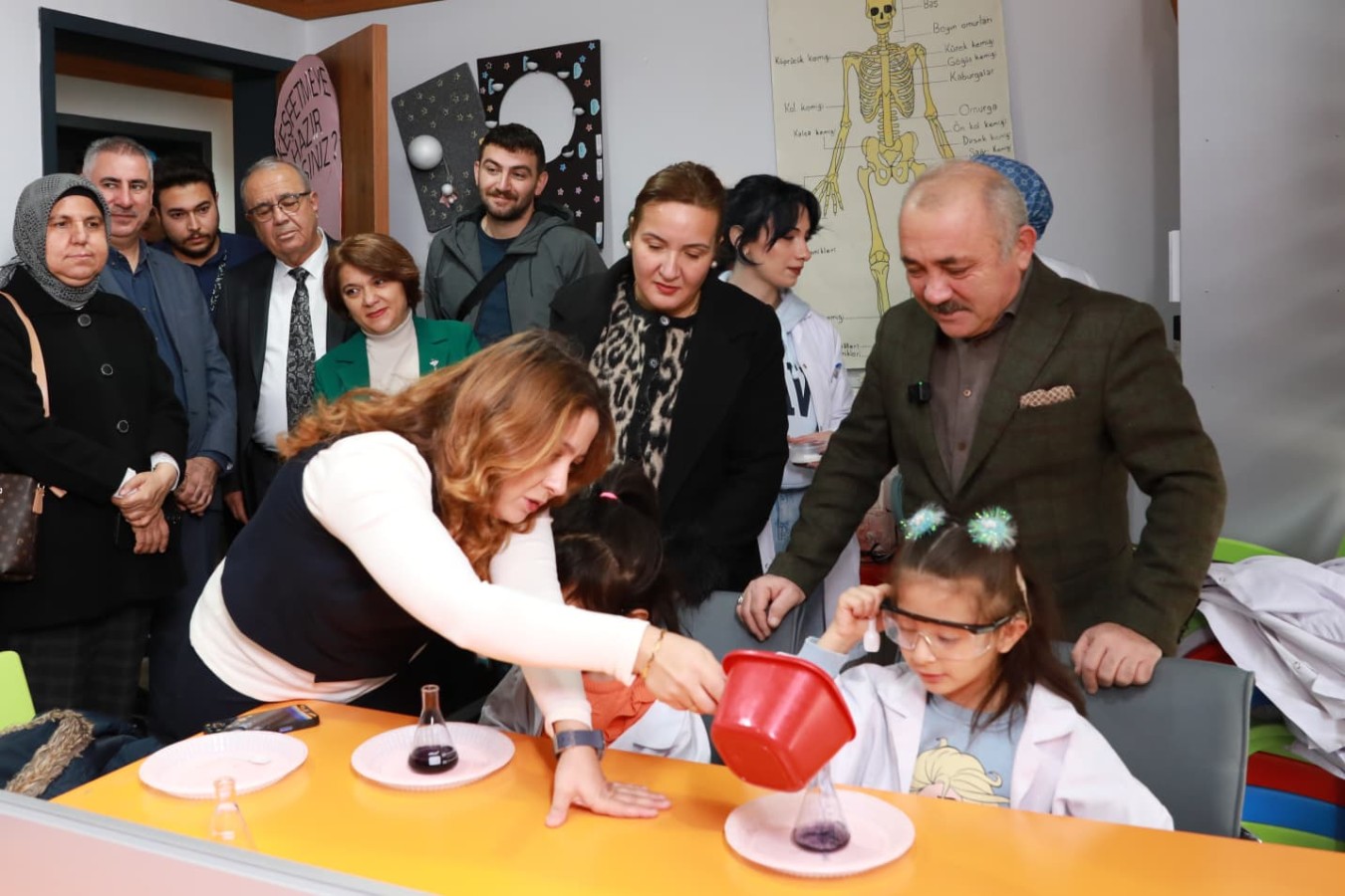 Fatih Sultan Mehmet Çocuk Akademisini gezen çocuklar, uygulamalı bilim çalışmalarına da katıldı. Renkli sıvılar ve roket deneyini titizlikle gerçekleştiren çocuklar, deneyin tüm aşamalarını Başkan Esen’e anlattı.