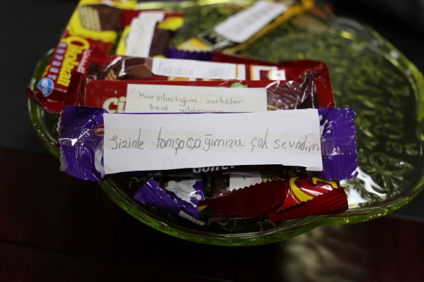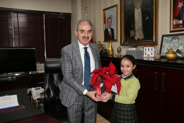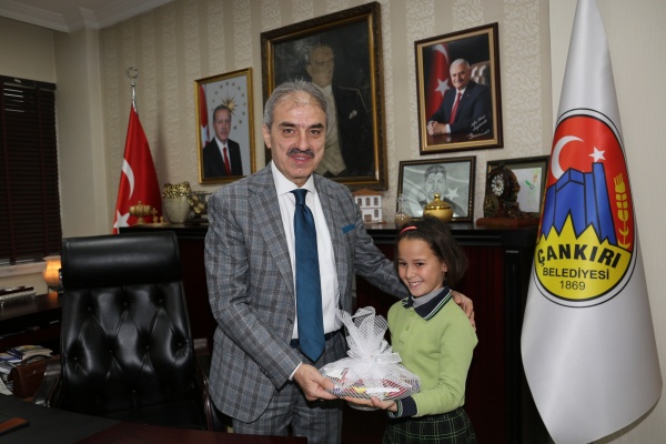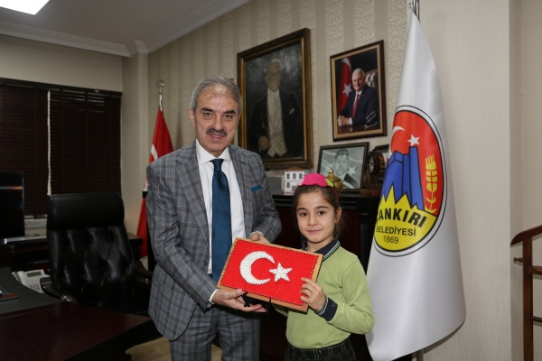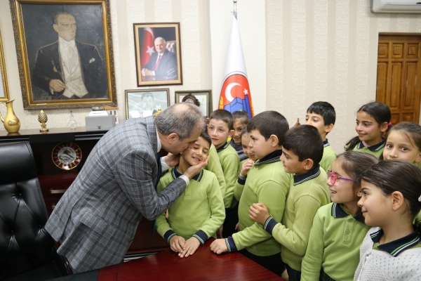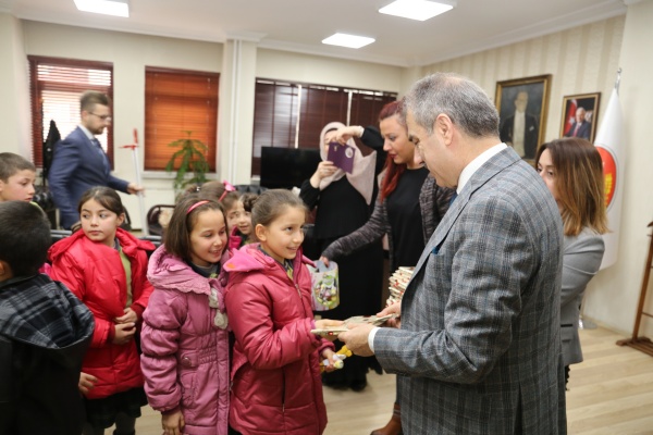Esentepe Mahallesi 30 Ağustos İlkokulu 4/A sınıfı öğrencileri Belediye Başkanı İrfan Dinç’i makamında ziyaret etti. Öğrencilerin meraklı sorularını yanıtlayan Dinç, çocukların hediyeleri karşısında hem şaşırdı hem de çok mutlu oldu. Ahşap üzerine çakılan çivilere kırmızı beyaz ipleri geçirerek yaptıkları Türk bayrağını Başkan Amcalarına hediye eden çocuklar, “Tatlı yiyelim tatlı konuşalım” diyerek üzerinde kendi el yazıları ile temennilerini yazdıkları çikolataları da ikram etti.