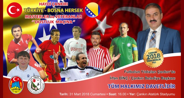 Çankırı Belediyesi, Türkiye Masterler ve Veteranlar Federasyonu Başkanı Kenan Gürsu’nun desteği ile bir ilke daha imza atarak futbolun renkli simalarını Çankırı’da ağırlayacak. Başkan Dinç, 31 Mart 2018 Cumartesi günü saat 16.00’da Atatürk Stadı’nda düzenlenecek “Futbol Şöleni”ne tüm Çankırılıları aileleri ile beklediklerini ifade etti. Çankırı Belediyesi tarafından ücretsiz olarak gerçekleştirilecek dostluk maçı öncesi taraftara bayrak da dağıtılacak.  Türkiye Masterler ve Veteranlar Milli Takım kadrosunda Çankırı Belediye Spor Veteranlar Takımından Şenol Kıyak ve Selahattin Mutlu da yer alacak.
