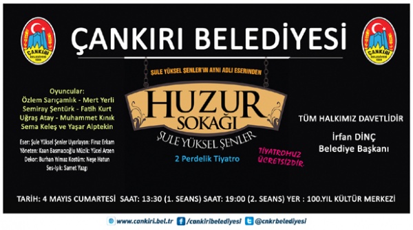 Çankırı Belediyesi, Şule Yüksel Şenler’in yazdığı ve Firuz Erkam tarafından uyarlanarak tiyatroya dönüştürülen “Huzur Sokağı”nı Çankırı’da sanatseverlerle buluşturuyor.